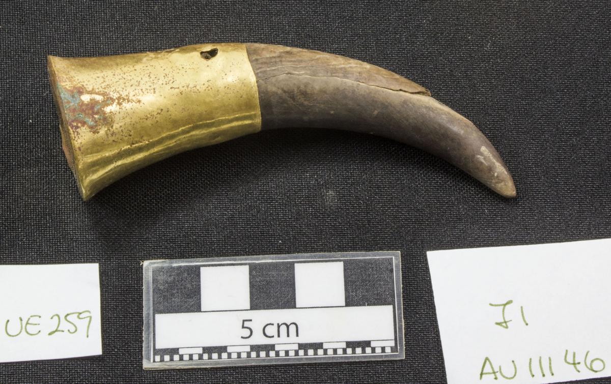 3571 - Diente perforado de tiburón. La perforación indica que pudo haber formado parte de un artefacto ornamental.