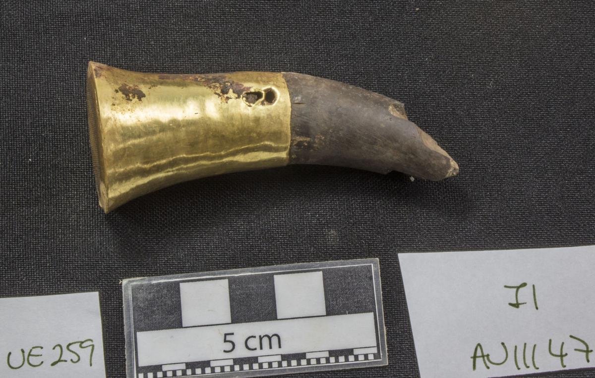 3592 - Canino de perro perforado. Aunque se encuentra fragmentado, se conservan sus partes.