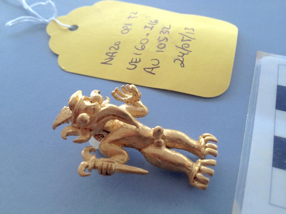 Vista cenital oblicua el pendiente figurativo de oro fundido AU10532 representando un hombre desnudo en trance, ataviado con tocado y máscara de ave. 3,9 x 3 cm. Estilo Conte.