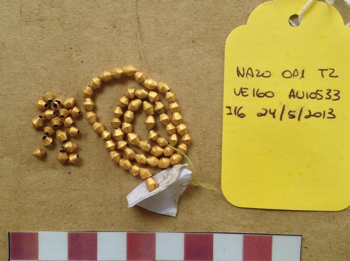 377 - Pendiente figurativo de oro fundido con la representación de un murciélago bicéfalo en vuelo que formaba parte del ajuar del individuo I5 de la tumba T2. EL aro de suspensión se localiza...