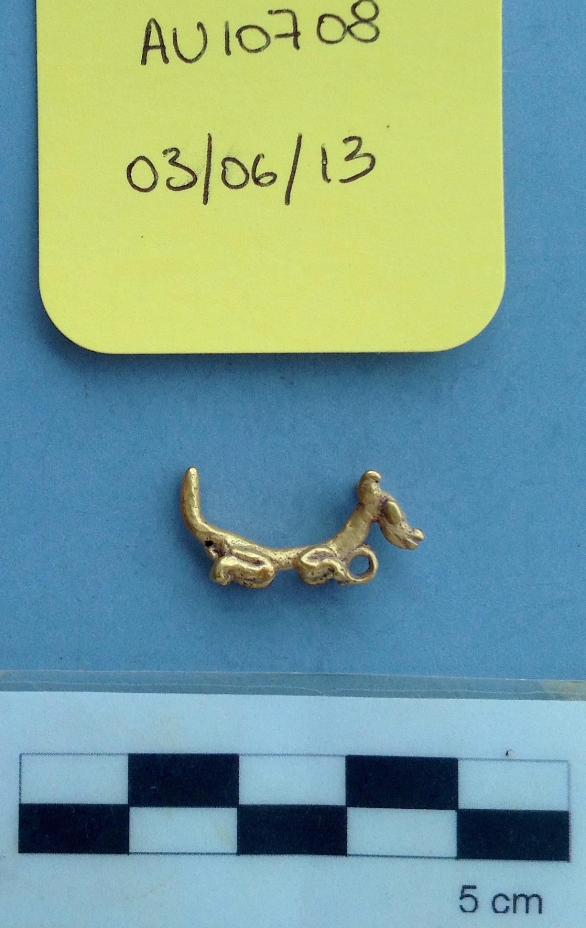 377 - Pendiente figurativo de oro fundido con la representación de un murciélago bicéfalo en vuelo que formaba parte del ajuar del individuo I5 de la tumba T2. EL aro de suspensión se localiza...