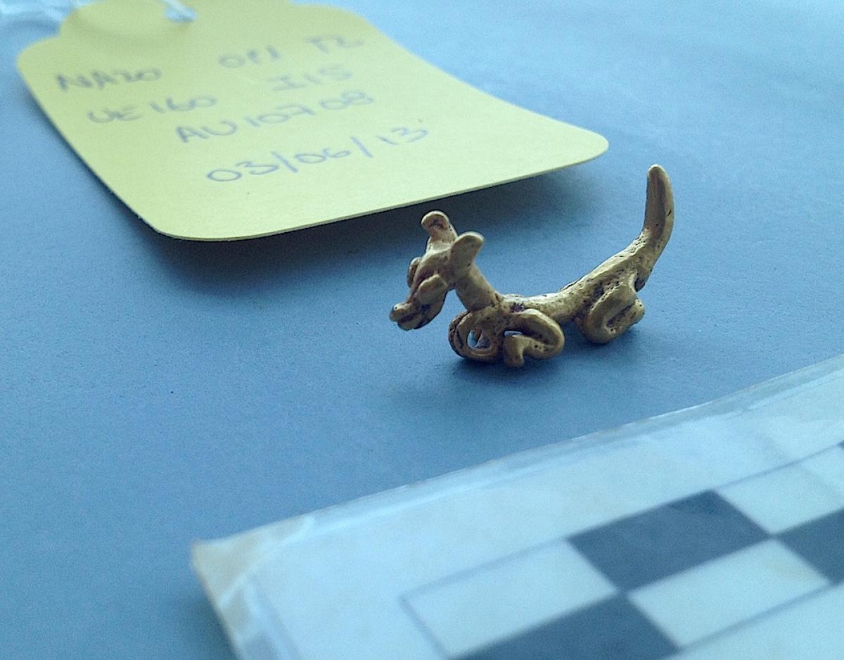 374 - Pendiente zoomorfo representando a un pelícano con la cabeza girada y apoyada sobre el lomo. Presenta la boca dentada y dos orificios para ser colgada. Formaba parte de un collar de canino...