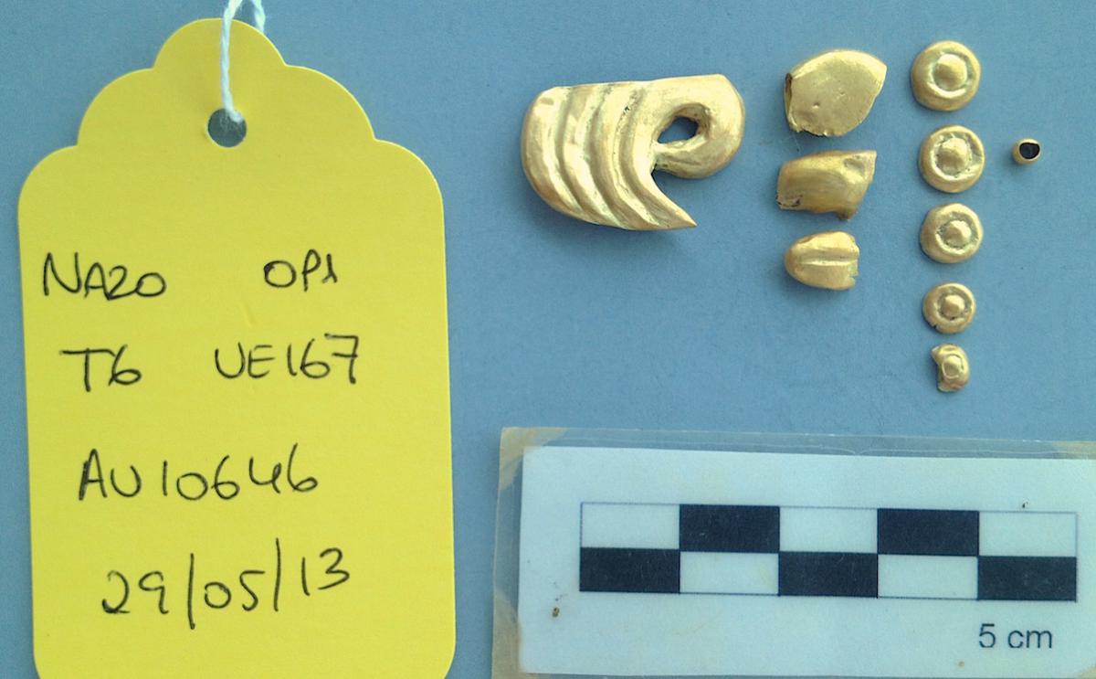Fundas de oro. Podrían ser parte de un mismo pendiente o figura de resina o madera.