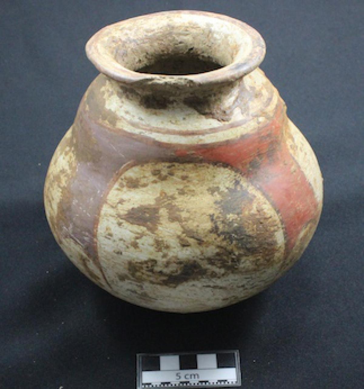 3565 - Jarra globular con base anular, cuello largo y borde recto. Engobe de color rojo en el exterior y engobe de color blanco sobre el cuello. Banda de color morado sobre el cuello.