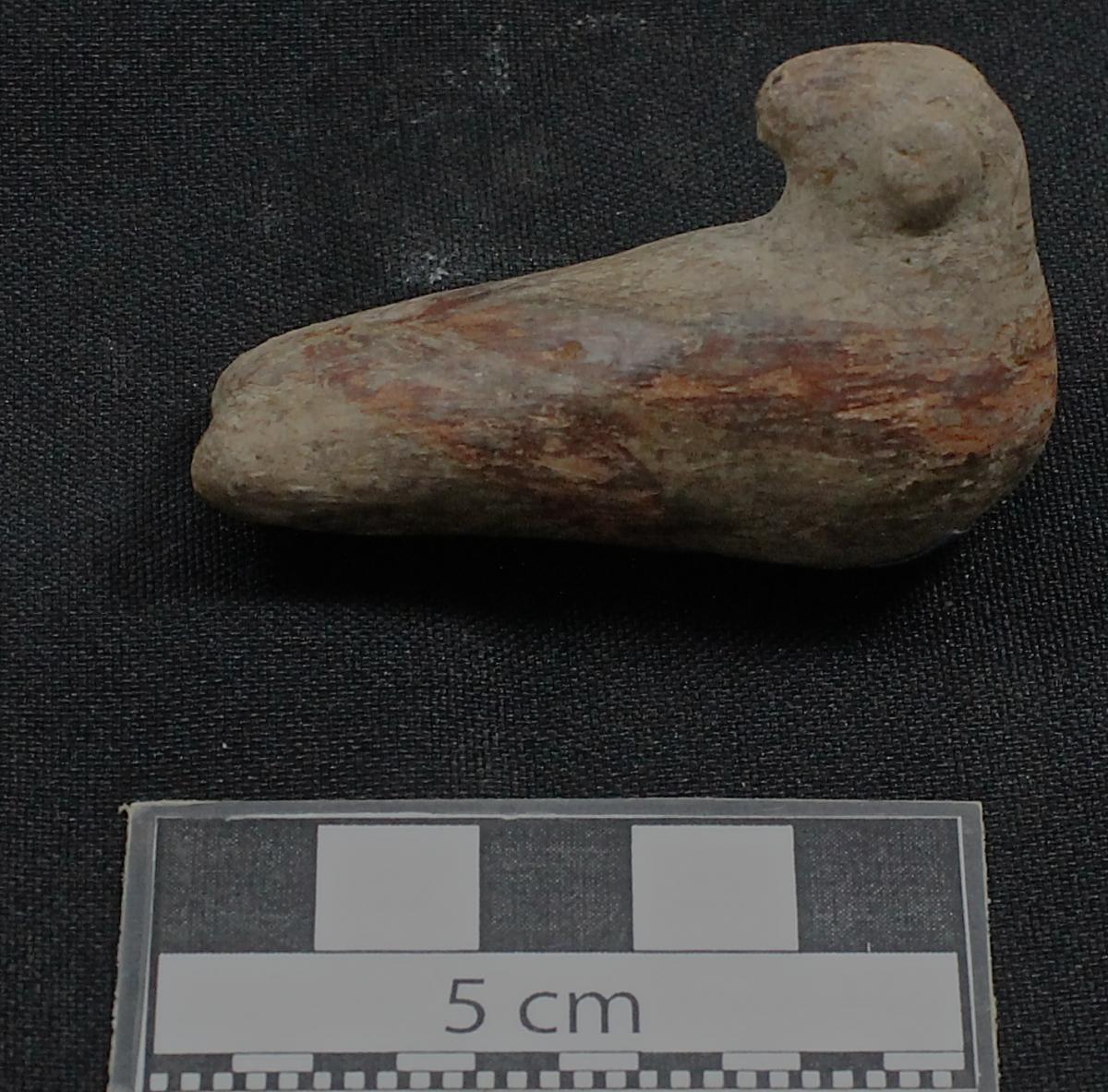 3654 - Efigie zoomorfa polícroma de cuerpo biglobular representa un ave del orden Pelecaniformes, caracterizada por su morfología hemisférica, cola corta y un plumaje estilizado hacia atrás.