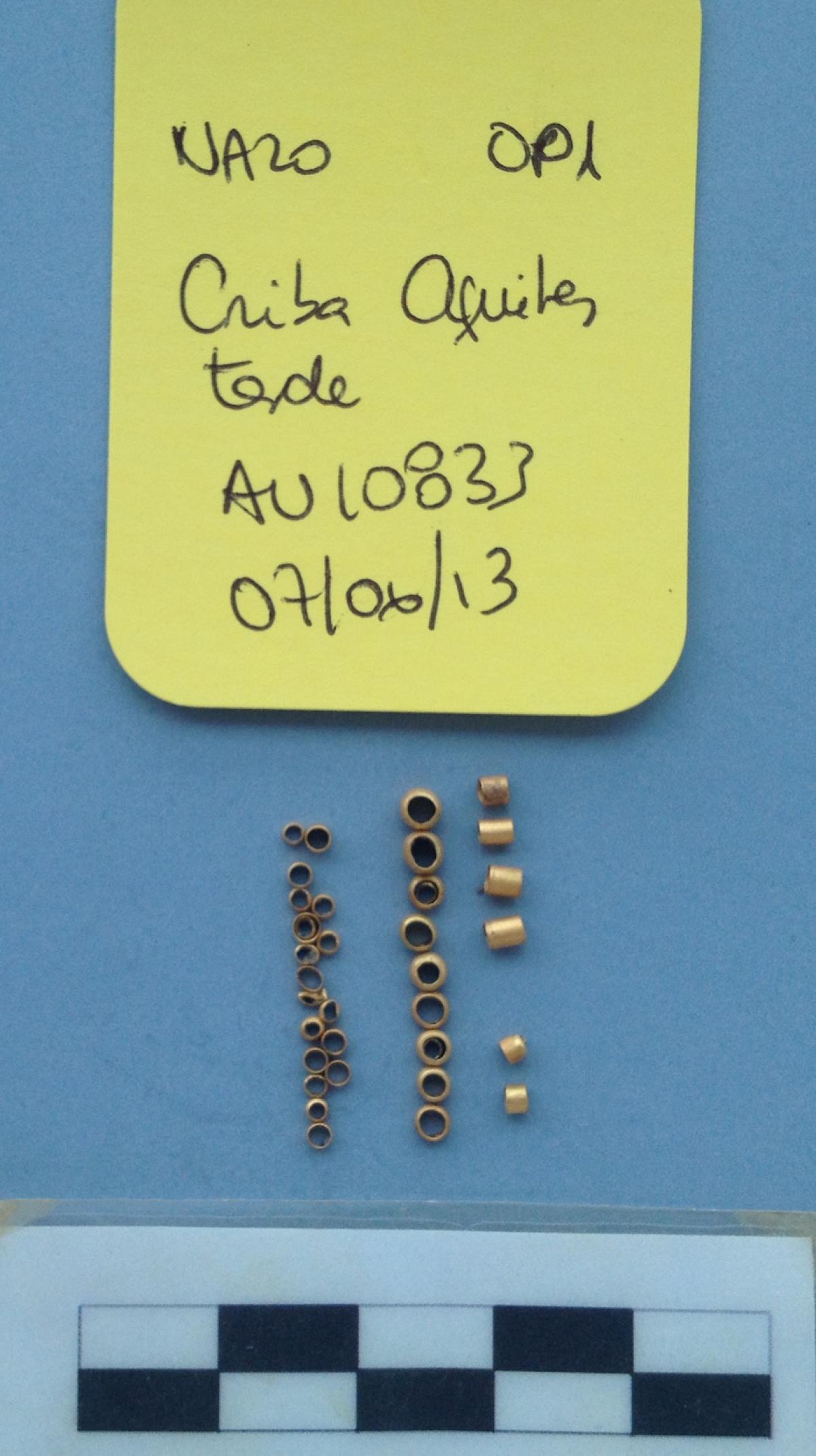Cuentas de oro circulares y cilíndricas.