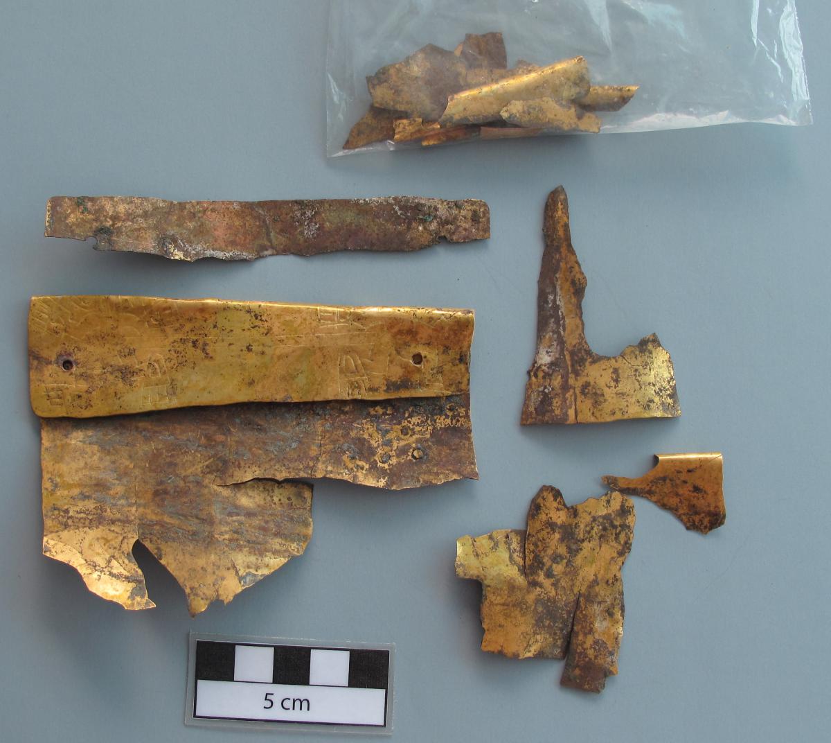 Fragmentos del brazalete de oro martillado AU10250. Lleva grabado dos cocodrilos antropomorfos de perfil ligados por un cinturón caminan erguidos en dirección contraria. Estilo Conte