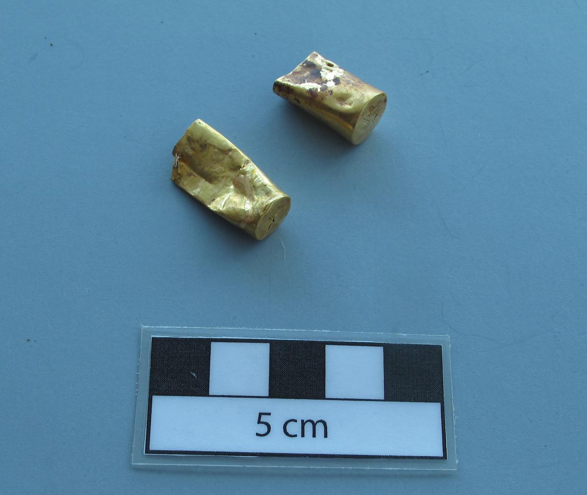 377 - Pendiente figurativo de oro fundido con la representación de un murciélago bicéfalo en vuelo que formaba parte del ajuar del individuo I5 de la tumba T2. EL aro de suspensión se localiza...