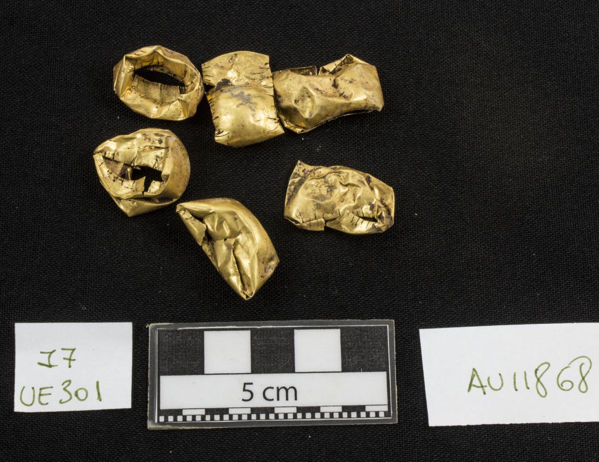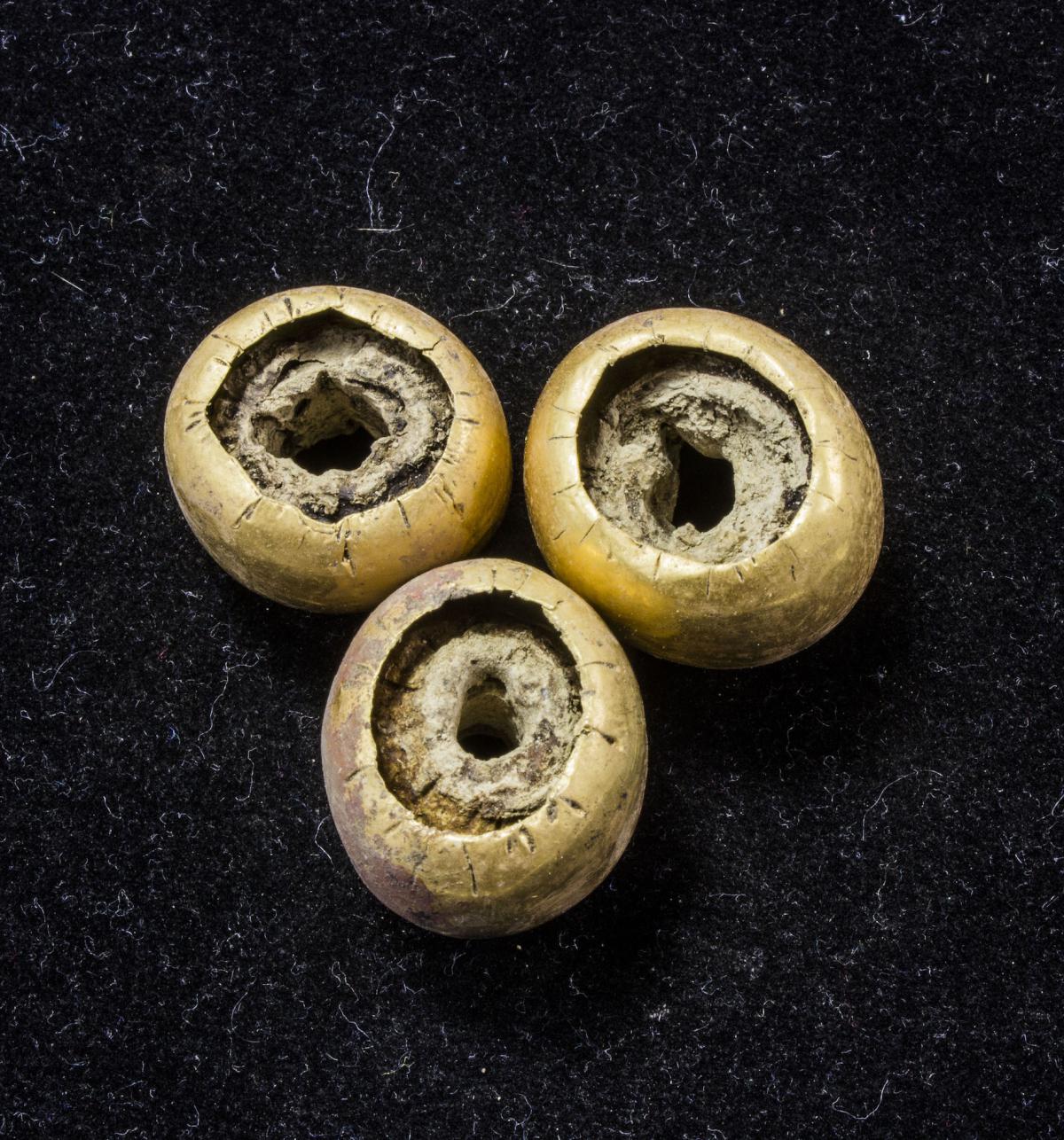 Detalle de las cuentas del cinturón. Puede apreciarse la resina en el interior de las fundas de oro.