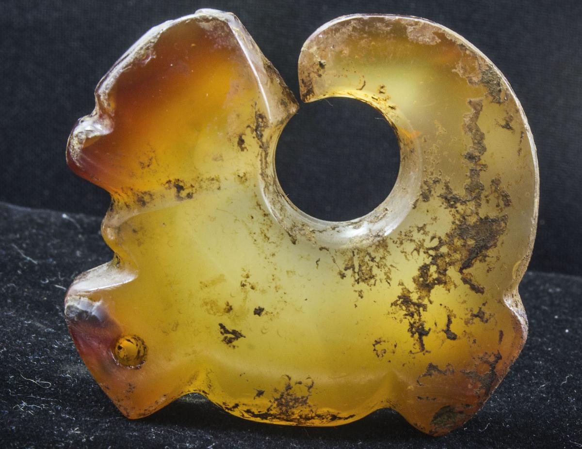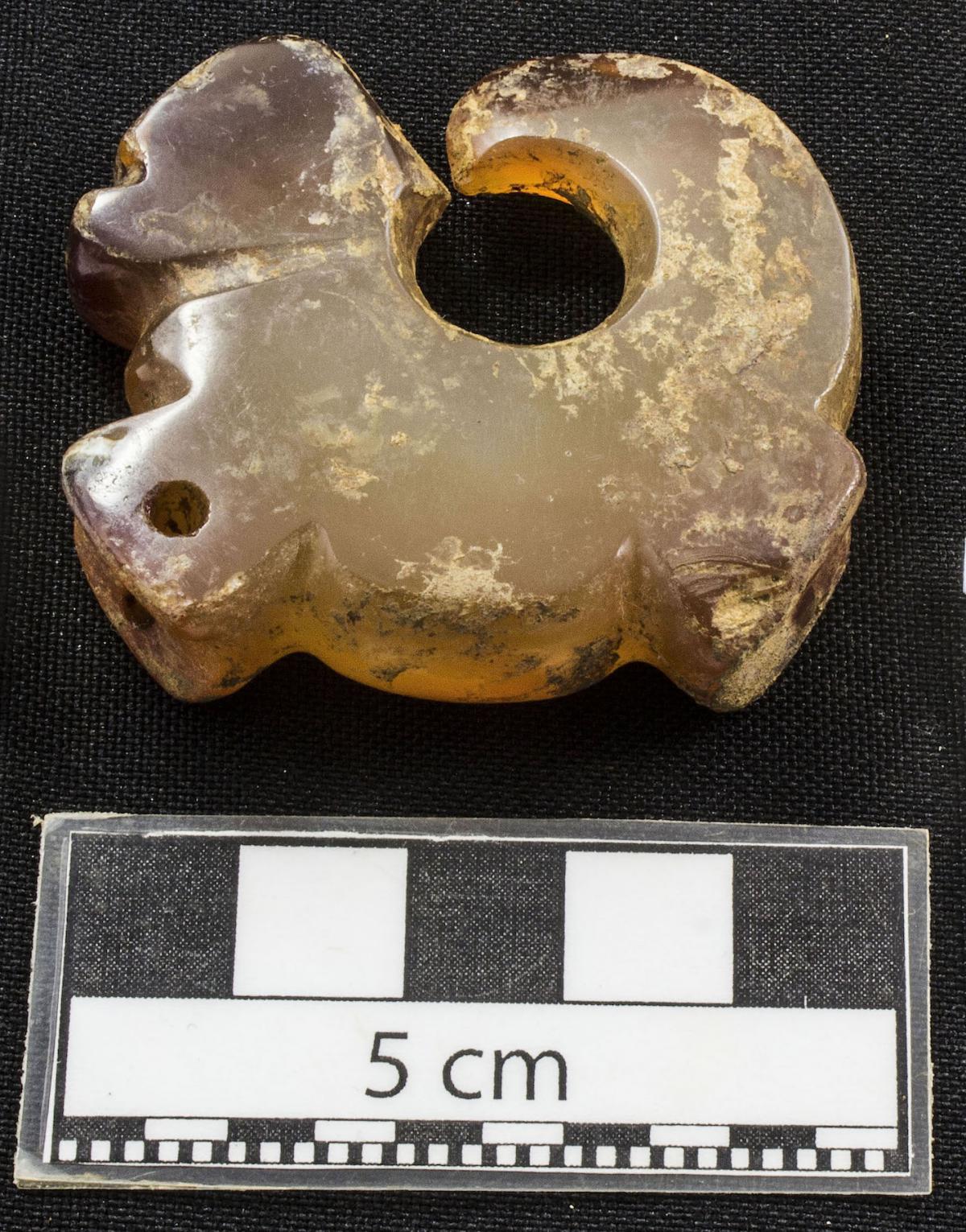 374 - Pendiente zoomorfo representando a un pelícano con la cabeza girada y apoyada sobre el lomo. Presenta la boca dentada y dos orificios para ser colgada. Formaba parte de un collar de canino...