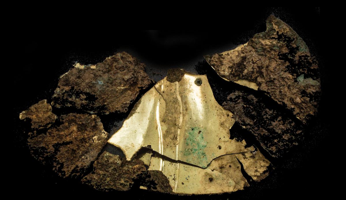 387 - Pectoral de oro martillado repujado con la representación frontal del rostro de un ser sobrenatural con rasgos de un anciano que formaba parte del ajuar del Individuo 20, un infante, de la ...