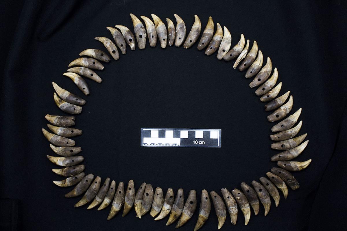 3567 - Conjunto de caninos de felino que integraban un collar ornamental, posiblemente asociado a símbolos de poder.