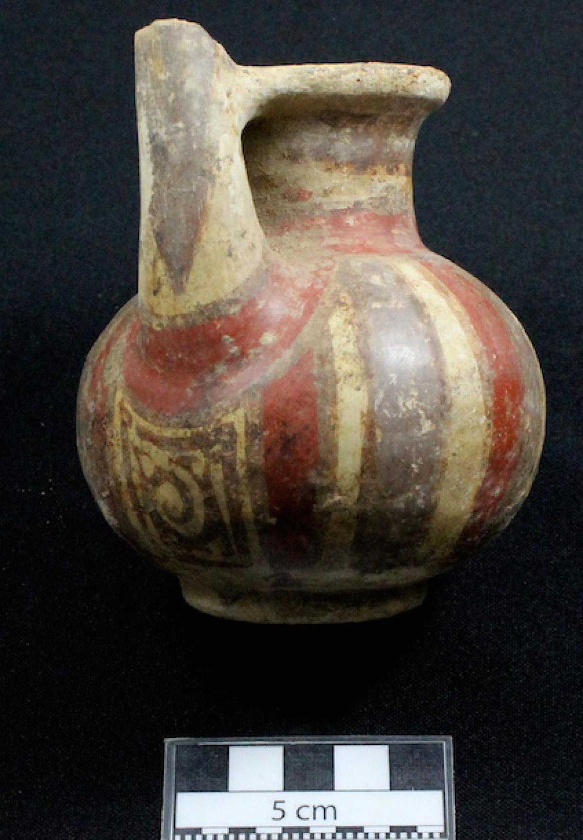 376 - Jarra polícroma carenada con hombros alzados y cuello largo. Engobe blanco y decoración de bandas de color alternas rojas y moradas.