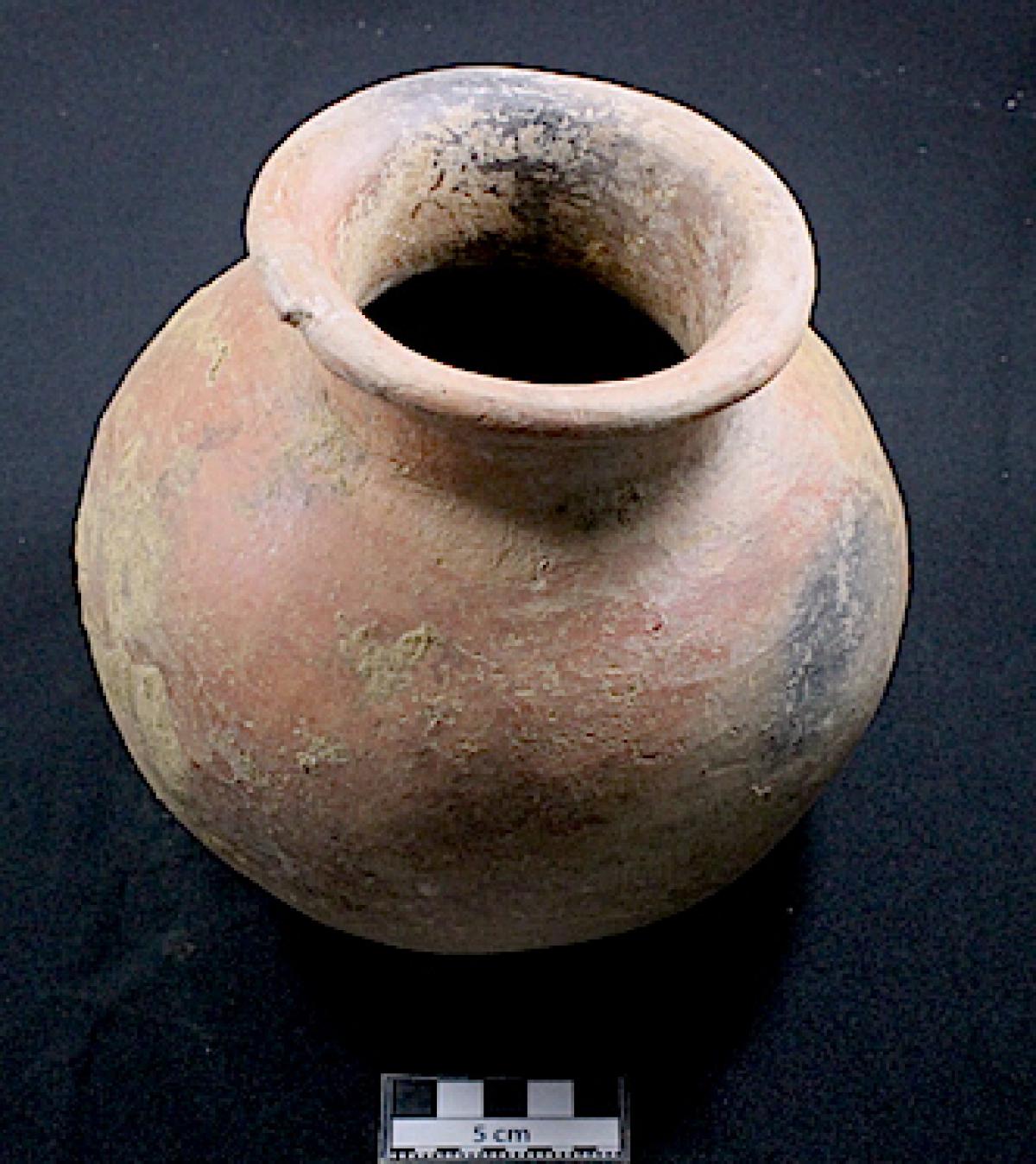 3566 - Jarra globular de base anular, cuello corto y borde plano. Engobe rojo en la superficie exterior.