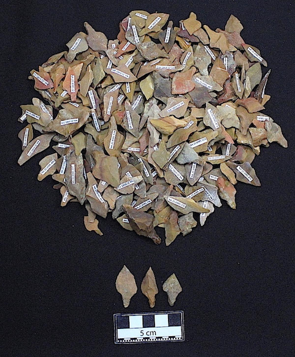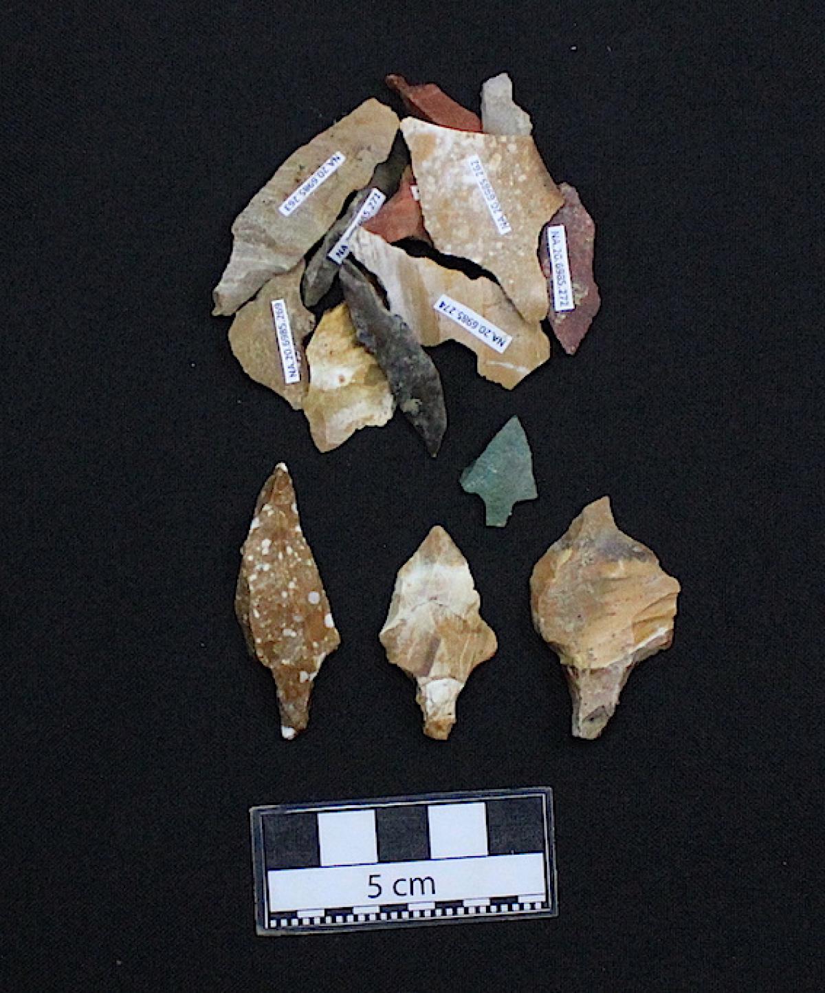 Puntas de proyectil de calcedonia color crema con vetas de otros colores.