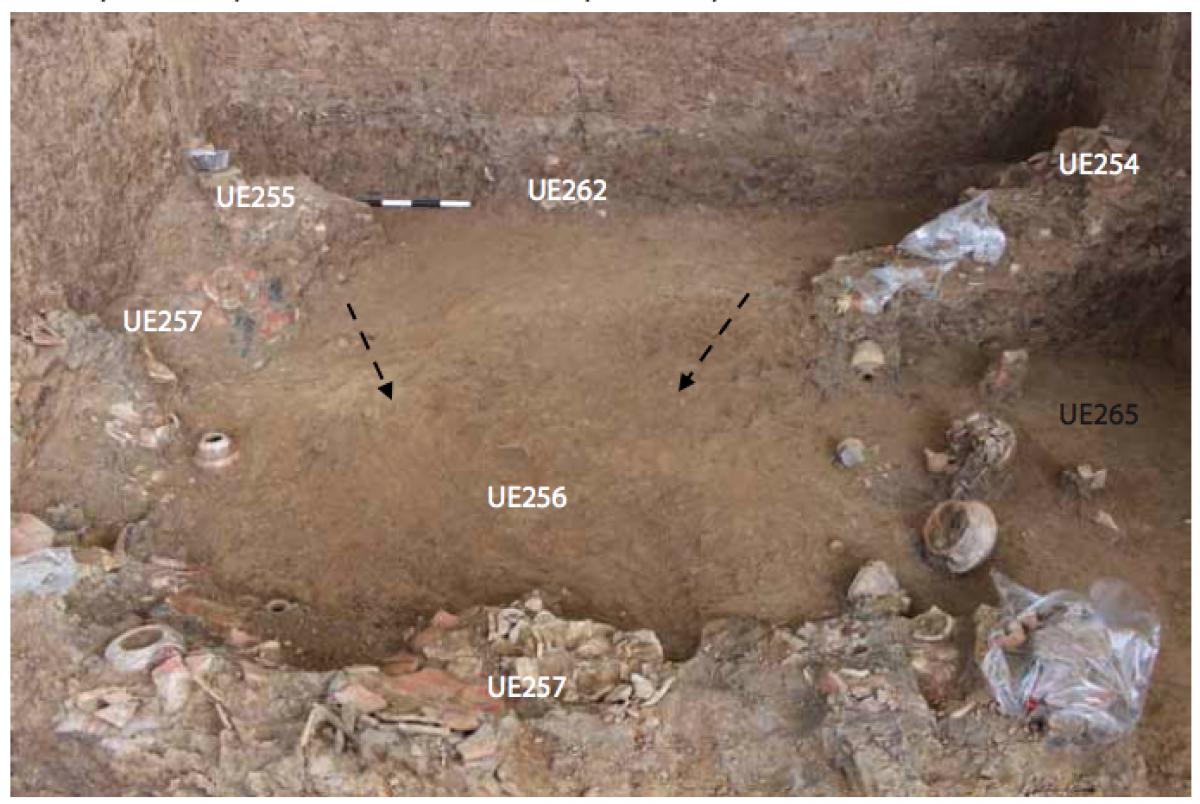 381 - T6-UE125 (a , (llamado en el año 2013, unidad UE167).Entierro de la tumba T6. Depósito de huesos humanos en posición primaria localizado a 3,48 m de profundidad. Es un entierro múltiple...