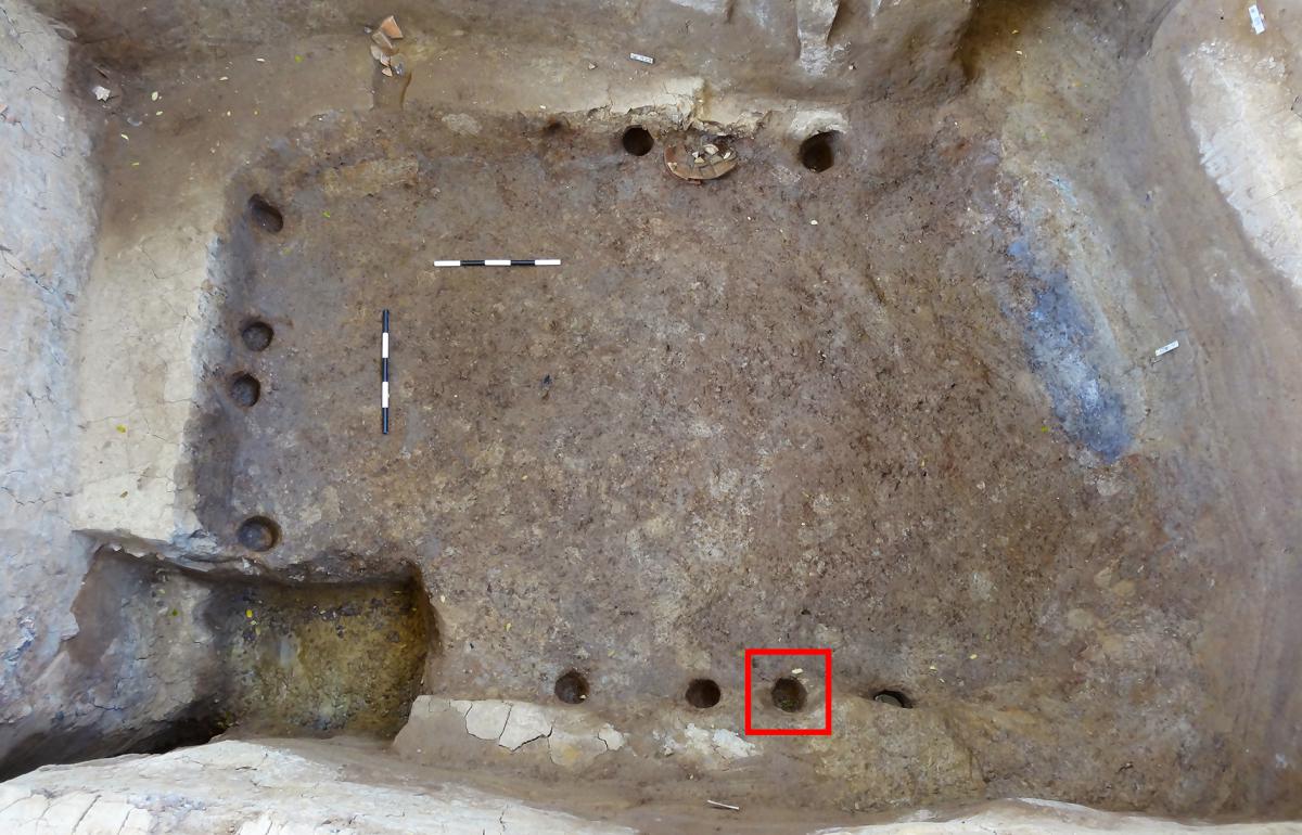 381 - T6-UE125 (a , (llamado en el año 2013, unidad UE167).Entierro de la tumba T6. Depósito de huesos humanos en posición primaria localizado a 3,48 m de profundidad. Es un entierro múltiple...