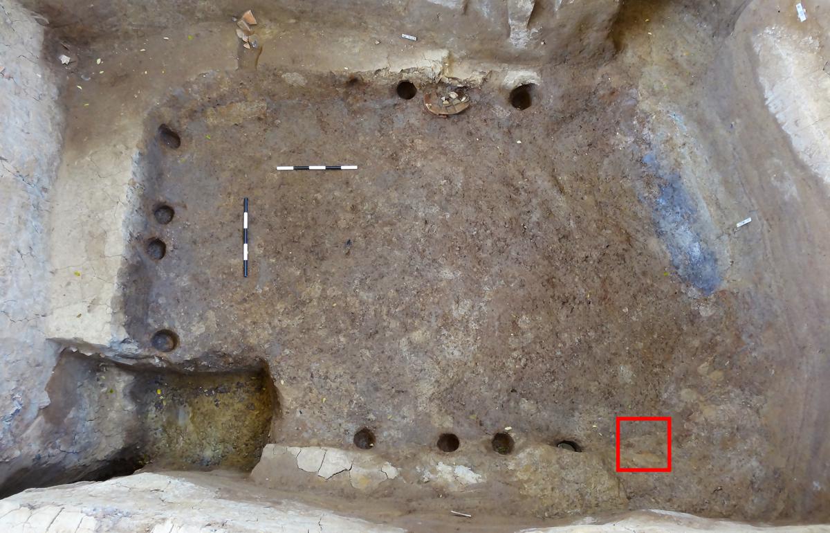 381 - T6-UE125 (a , (llamado en el año 2013, unidad UE167).Entierro de la tumba T6. Depósito de huesos humanos en posición primaria localizado a 3,48 m de profundidad. Es un entierro múltiple...