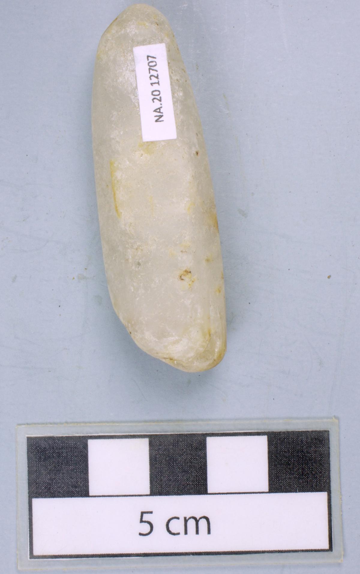383 - Pendiente de piedra de color ambarino. Es de forma alargada y presenta una perforación.