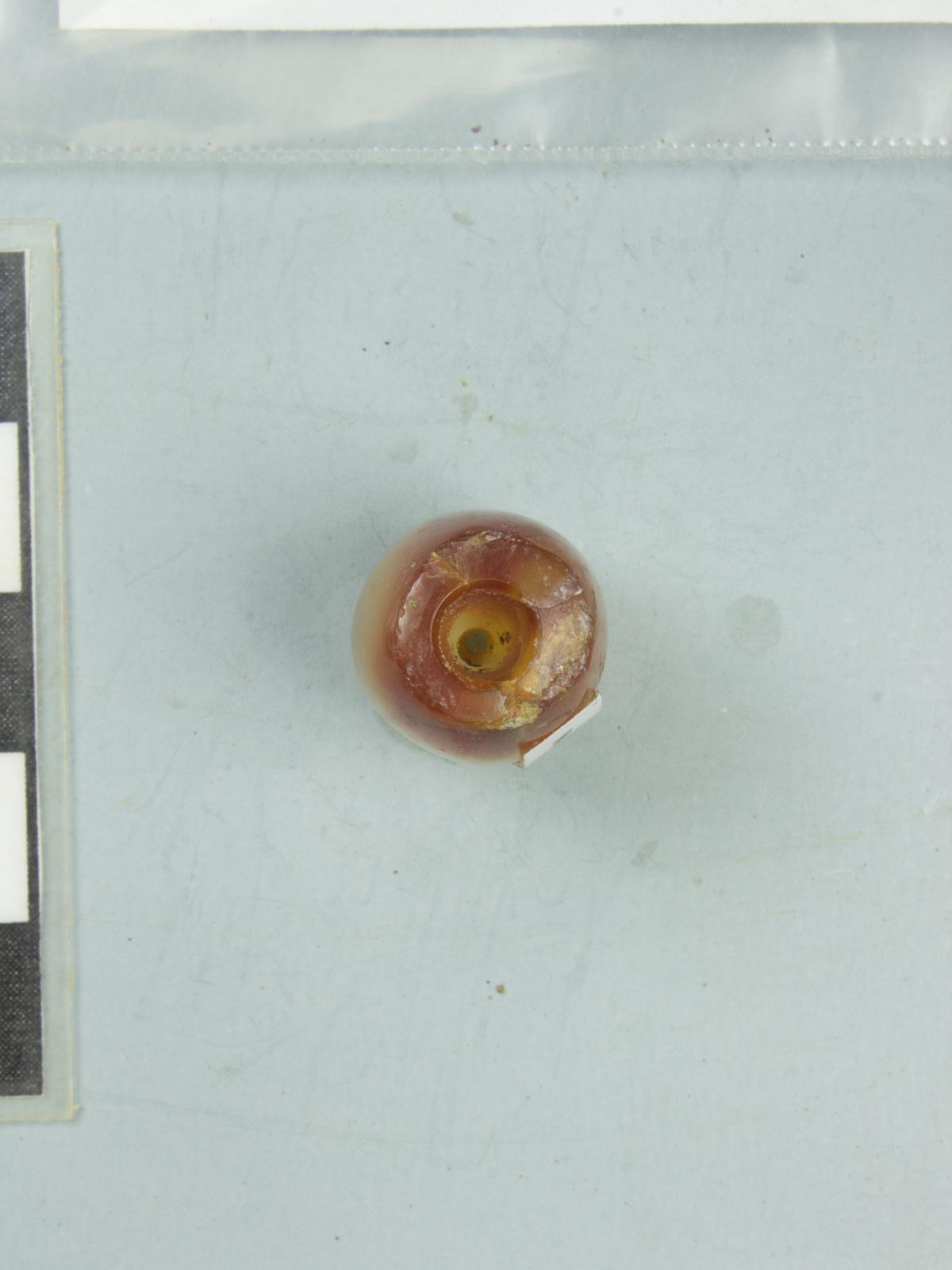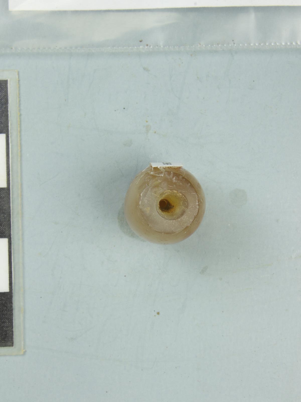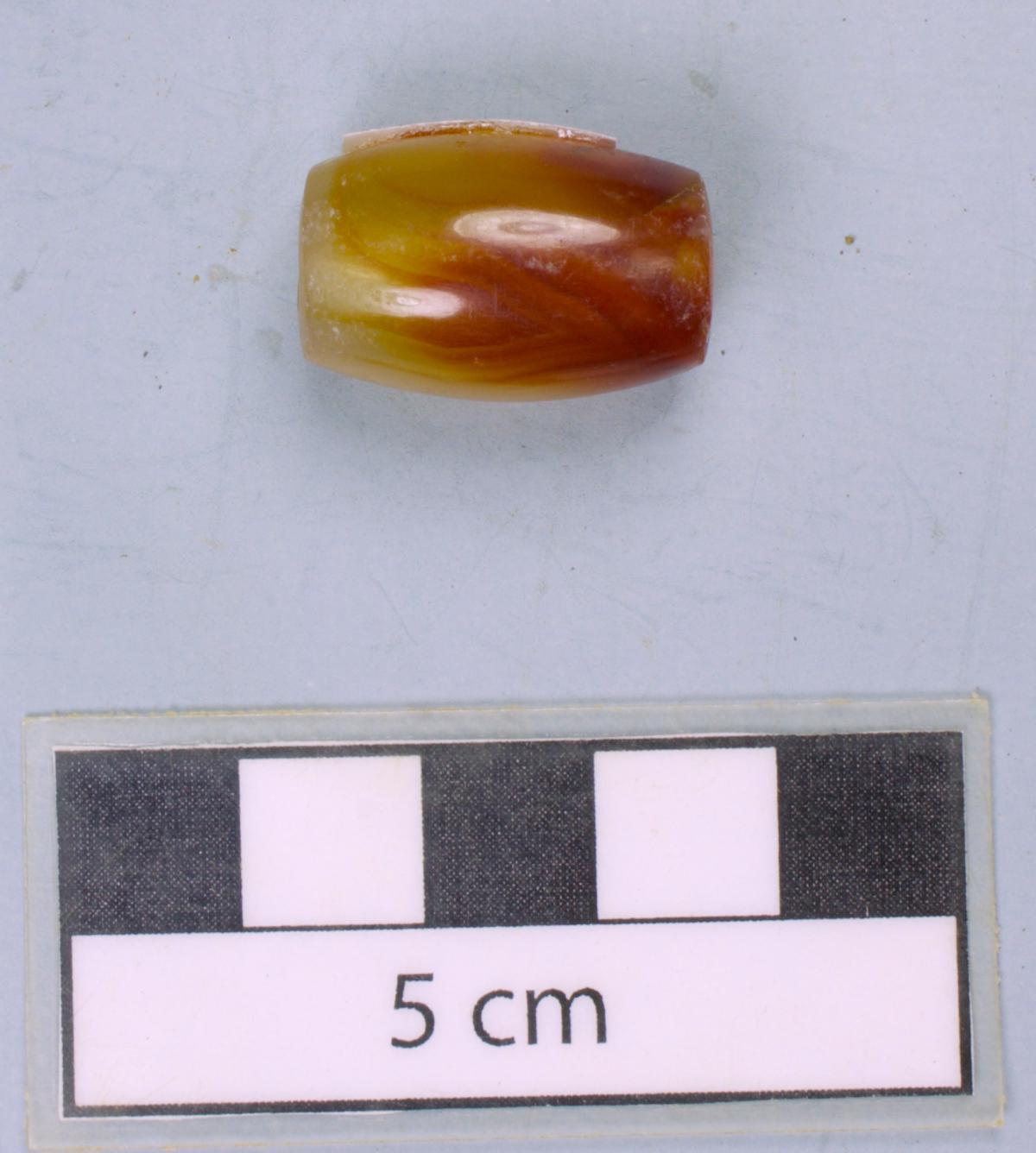 383 - Pendiente de piedra de color ambarino. Es de forma alargada y presenta una perforación.