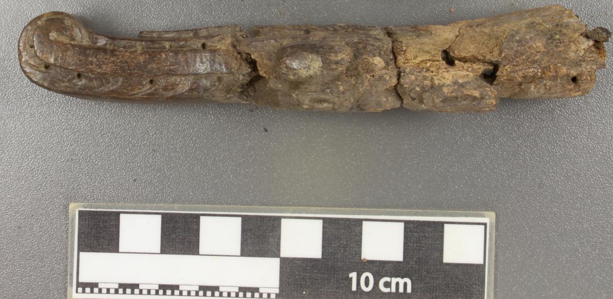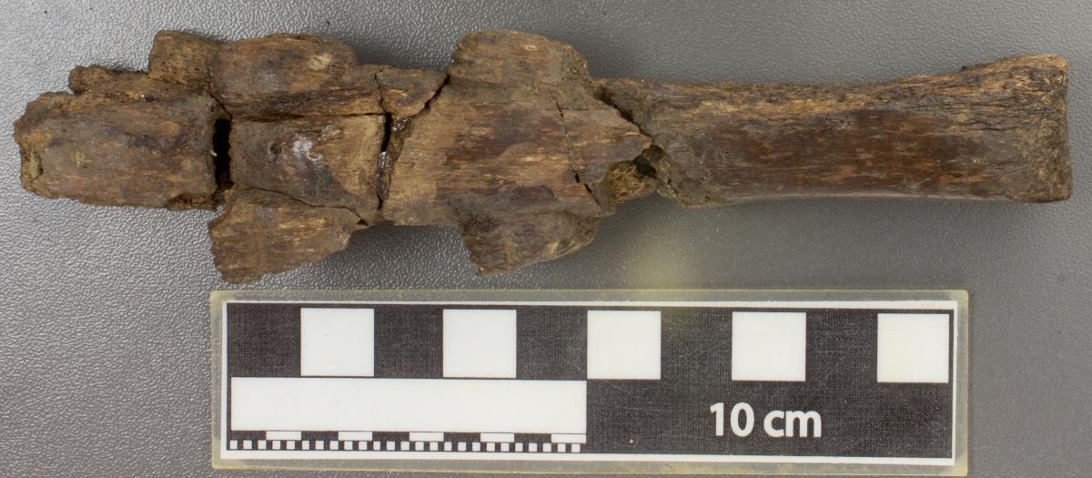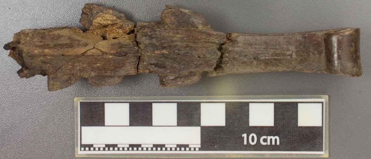 3606 - Hueso metapodiano trabajado de felino, parcialmente restaurado.