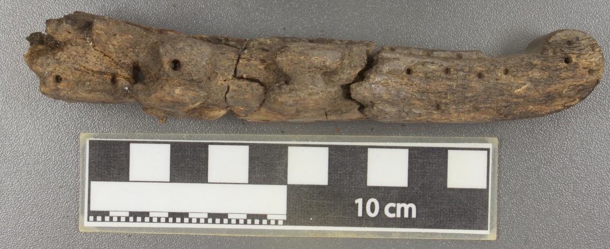 3592 - Canino de perro perforado. Aunque se encuentra fragmentado, se conservan sus partes.