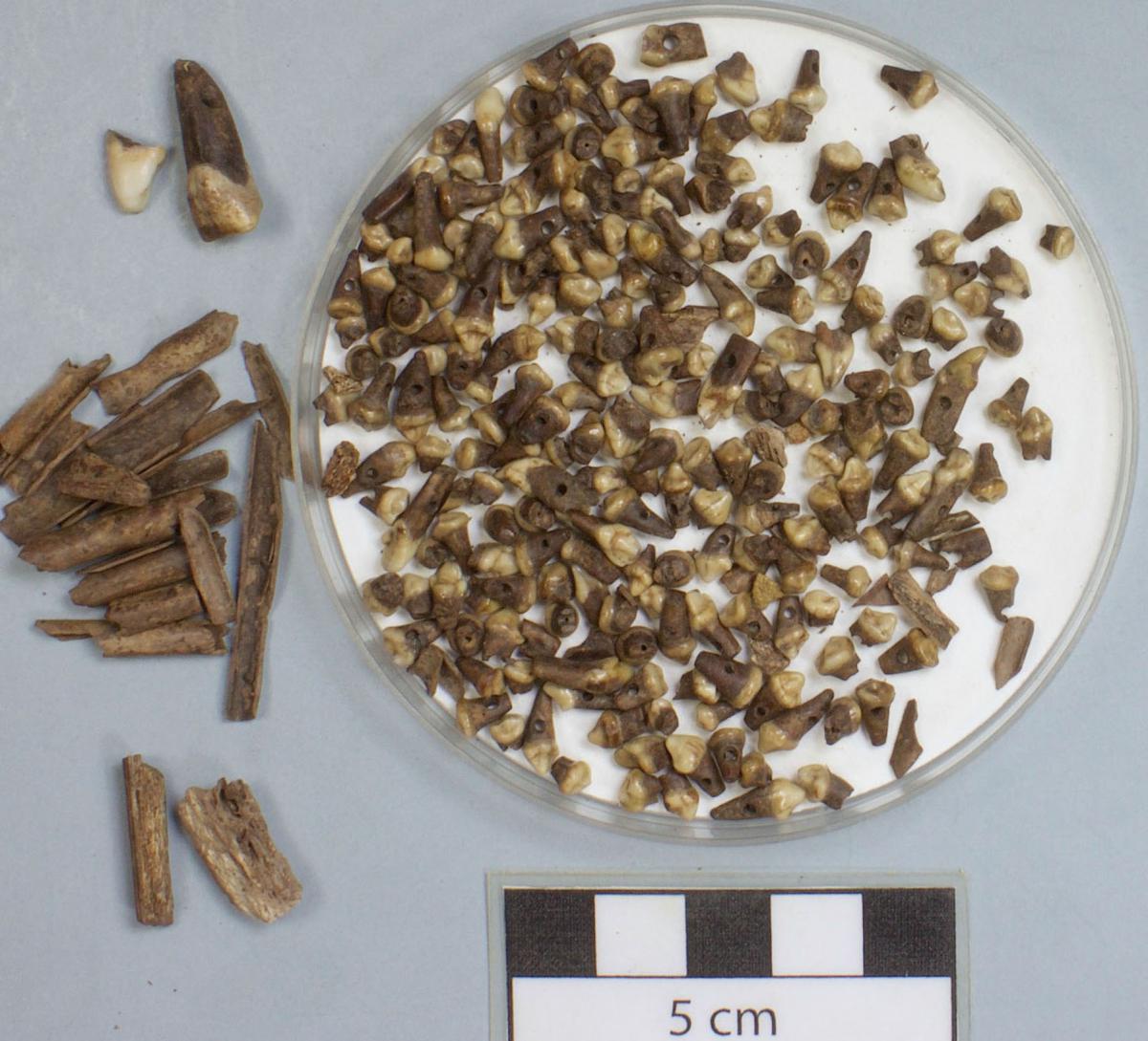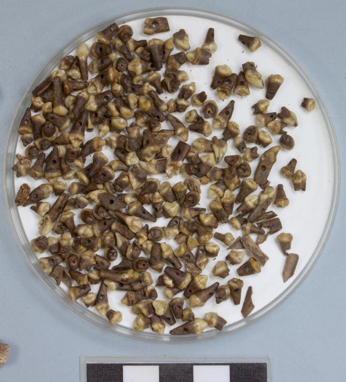 Dientes y premolares perforados junto a otros artefactos de hueso y diente recuperados en el mismo punto.