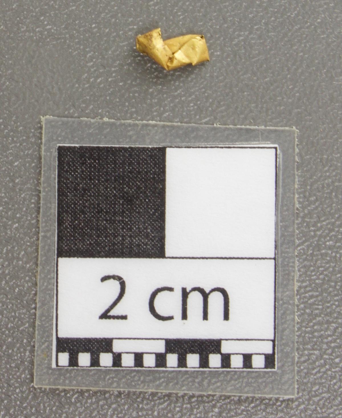 377 - Pendiente figurativo de oro fundido con la representación de un murciélago bicéfalo en vuelo que formaba parte del ajuar del individuo I5 de la tumba T2. EL aro de suspensión se localiza...