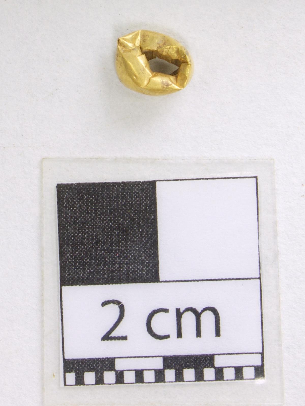 377 - Pendiente figurativo de oro fundido con la representación de un murciélago bicéfalo en vuelo que formaba parte del ajuar del individuo I5 de la tumba T2. EL aro de suspensión se localiza...