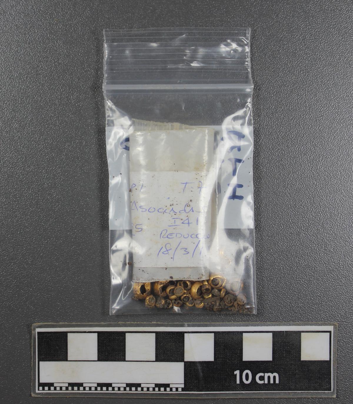 371 - S-UE003. Combustión de una raíz. Depósito de características semejantes a UE002, de 0,03 m de espesor, localizado en los cuadros de excavación A4, A5, B4 y B5. Se recuperó carbón. Baj...