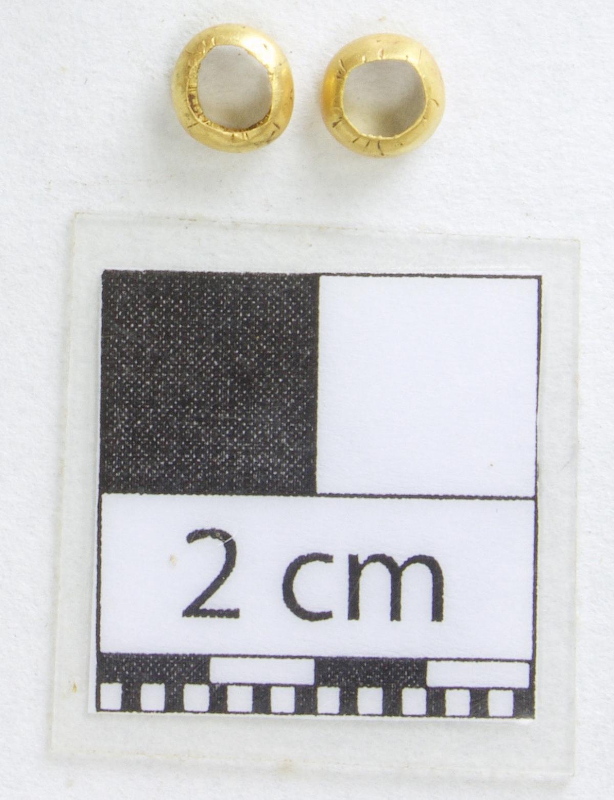 377 - Pendiente figurativo de oro fundido con la representación de un murciélago bicéfalo en vuelo que formaba parte del ajuar del individuo I5 de la tumba T2. EL aro de suspensión se localiza...