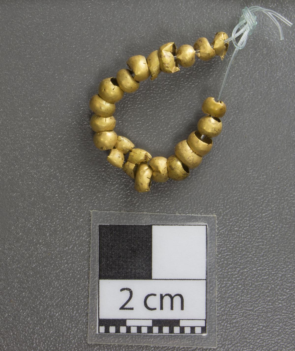 377 - Pendiente figurativo de oro fundido con la representación de un murciélago bicéfalo en vuelo que formaba parte del ajuar del individuo I5 de la tumba T2. EL aro de suspensión se localiza...