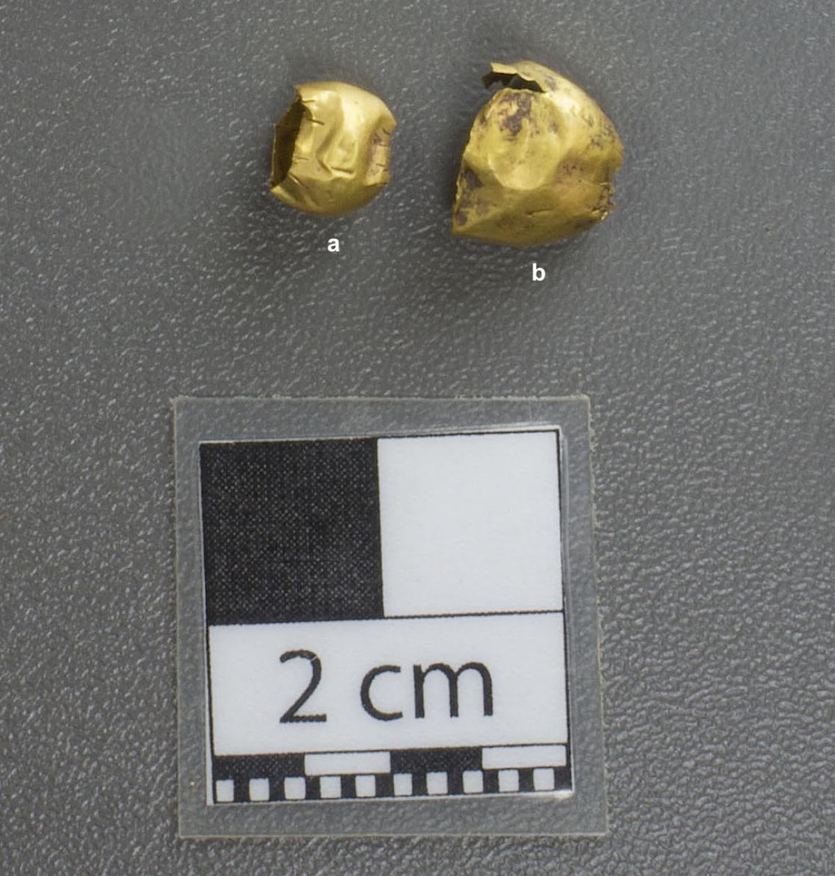377 - Pendiente figurativo de oro fundido con la representación de un murciélago bicéfalo en vuelo que formaba parte del ajuar del individuo I5 de la tumba T2. EL aro de suspensión se localiza...