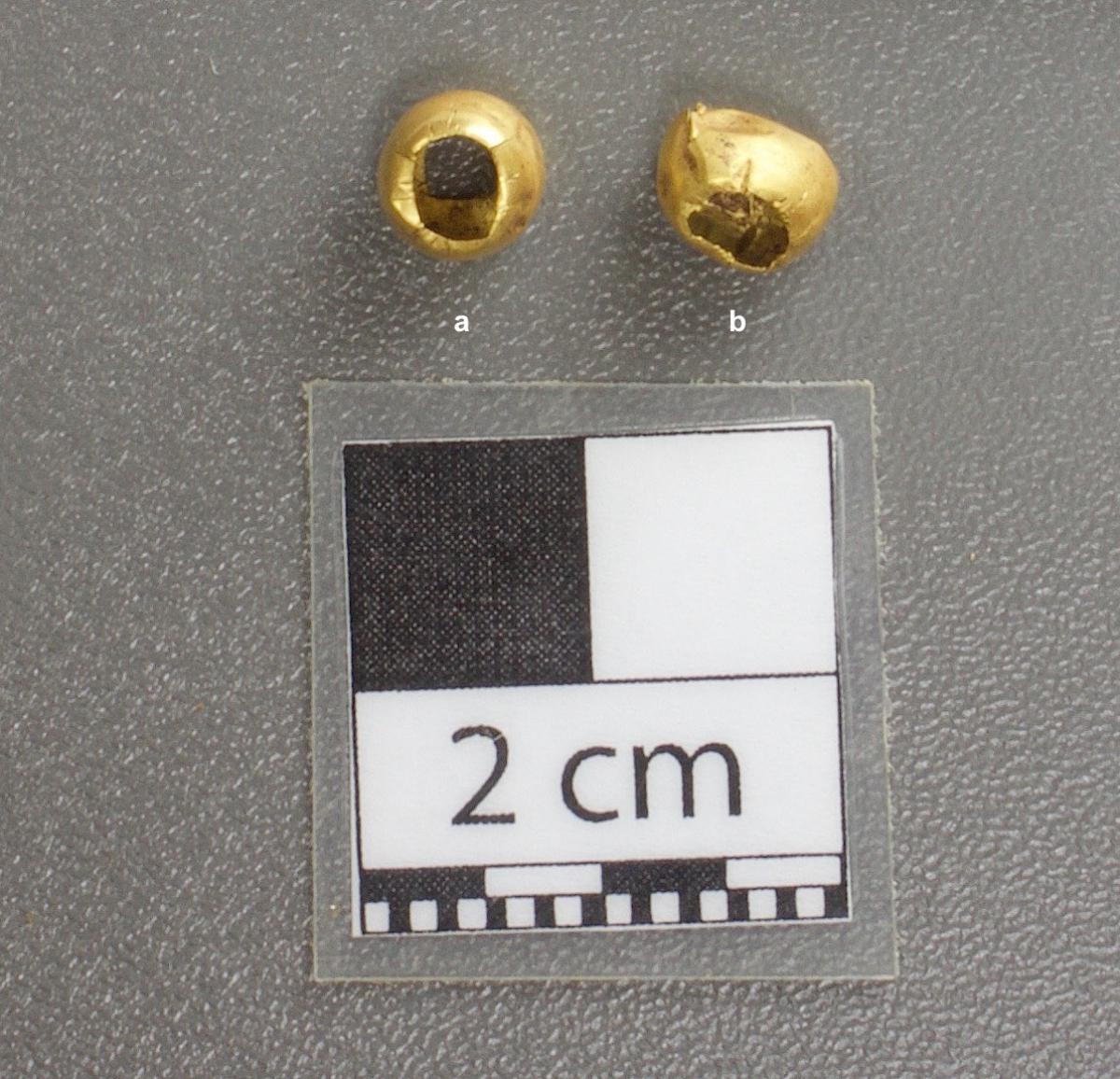 377 - Pendiente figurativo de oro fundido con la representación de un murciélago bicéfalo en vuelo que formaba parte del ajuar del individuo I5 de la tumba T2. EL aro de suspensión se localiza...