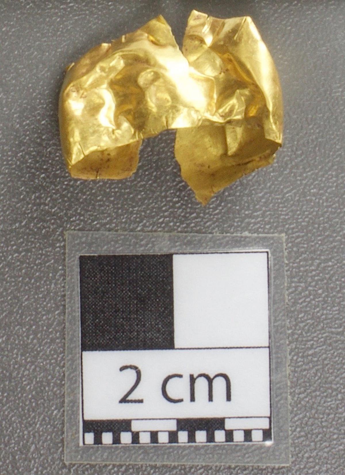 377 - Pendiente figurativo de oro fundido con la representación de un murciélago bicéfalo en vuelo que formaba parte del ajuar del individuo I5 de la tumba T2. EL aro de suspensión se localiza...