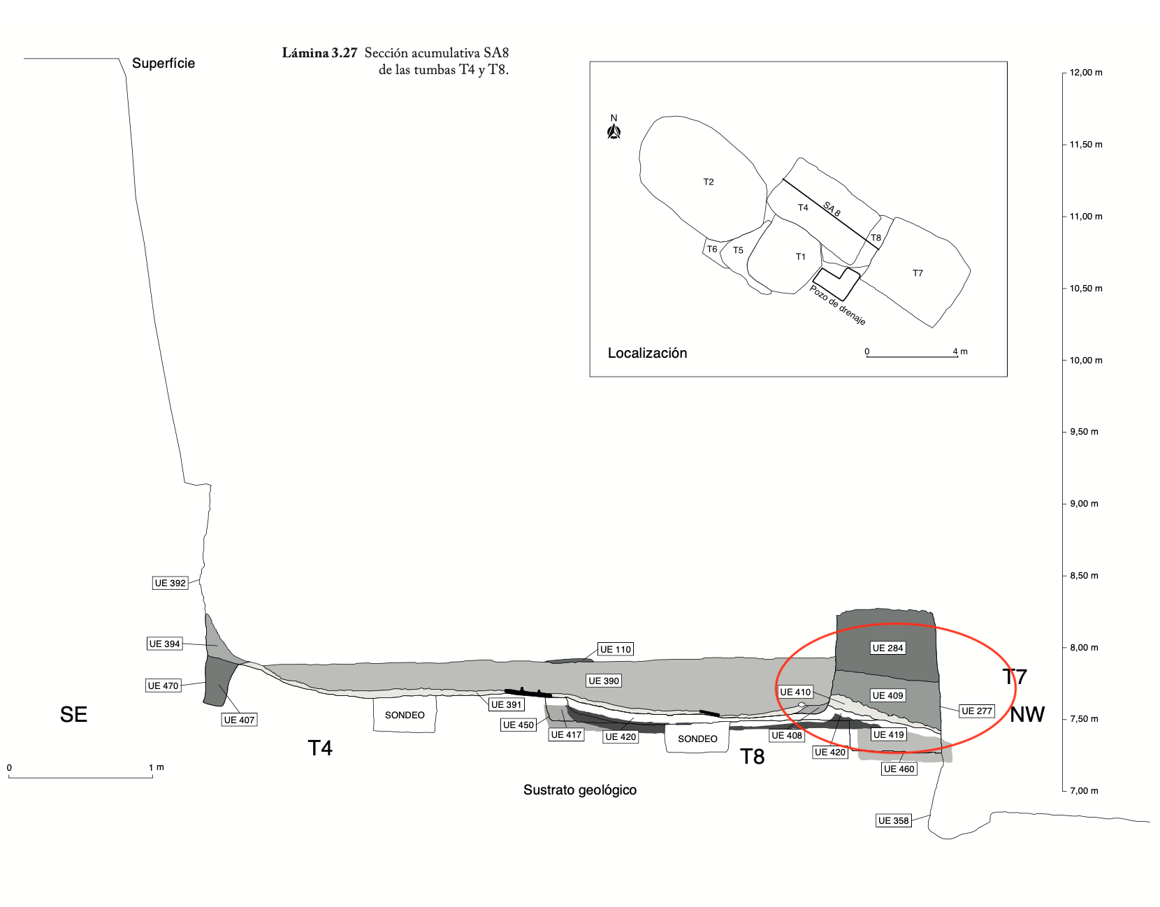 381 - T6-UE125 (a , (llamado en el año 2013, unidad UE167).Entierro de la tumba T6. Depósito de huesos humanos en posición primaria localizado a 3,48 m de profundidad. Es un entierro múltiple...