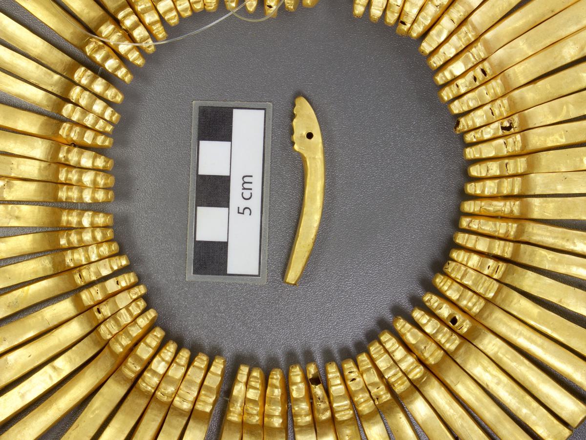 387 - Pectoral de oro martillado repujado con la representación frontal del rostro de un ser sobrenatural con rasgos de un anciano que formaba parte del ajuar del Individuo 20, un infante, de la ...