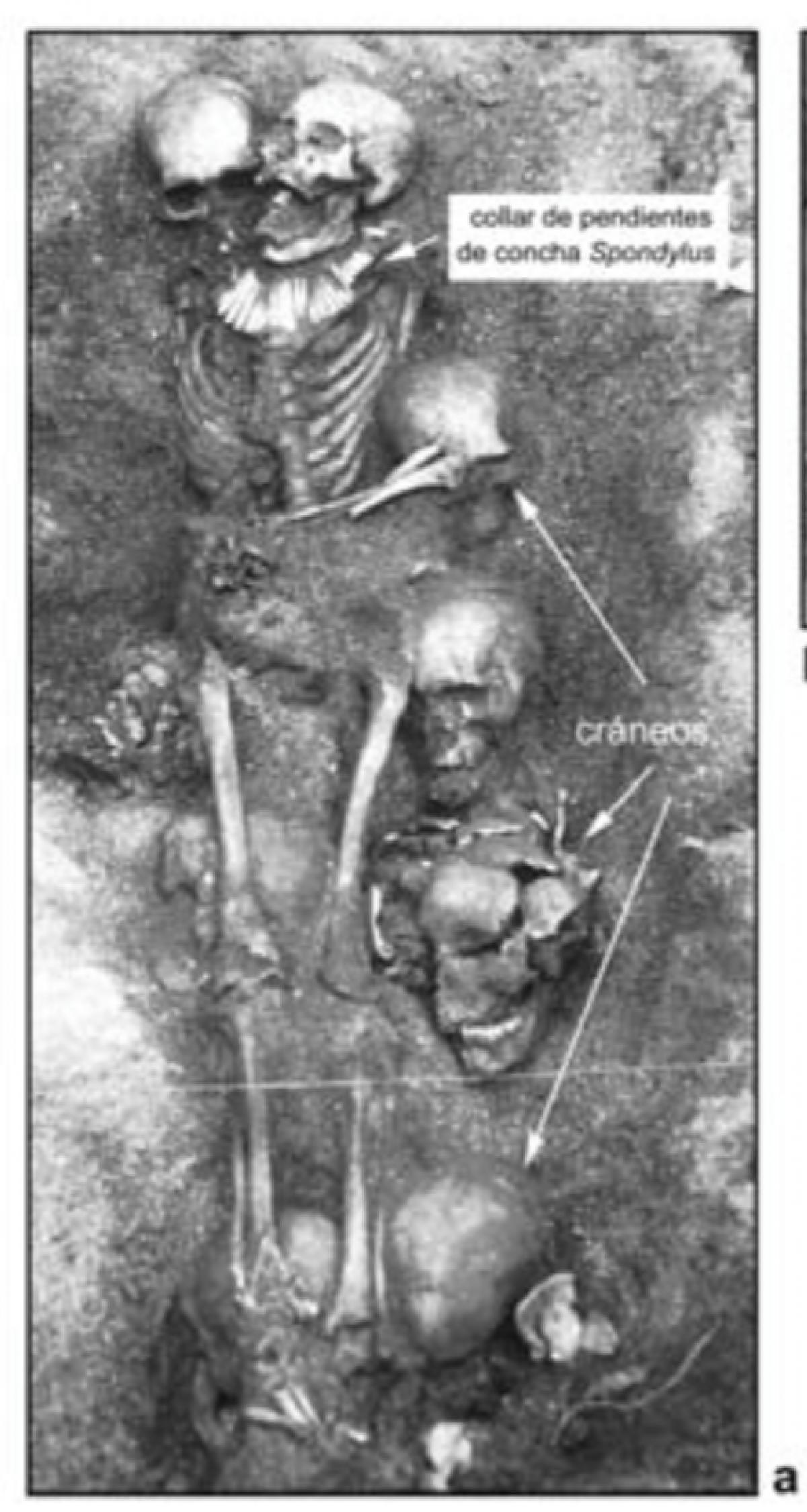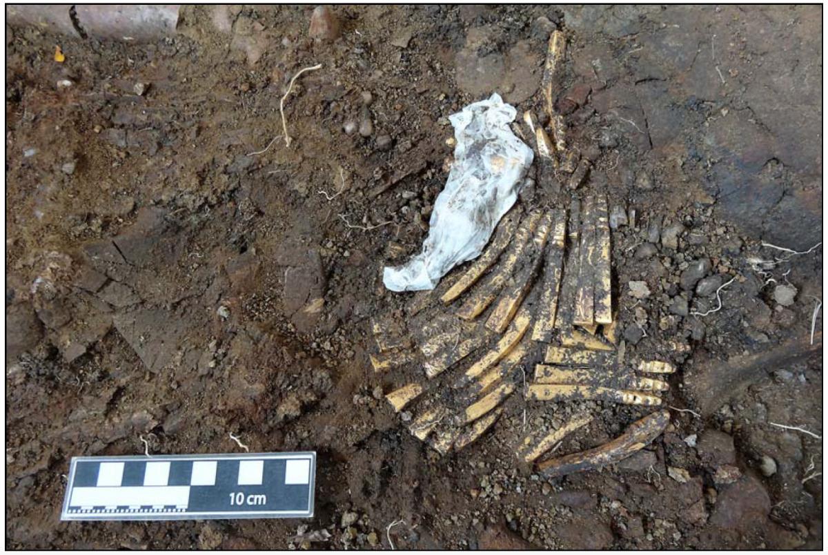 El collar in situ. Pueden apreciarse los huesos del cráneo, aplastados, y los dientes del individuo que lo llevaba puesto. El papel japonés de la foto cubre un pendiente elaborado con un diente de cachalote. El papel japonés con resina se usan para levantar aquellos artefactos de huesos que están fragmentados.