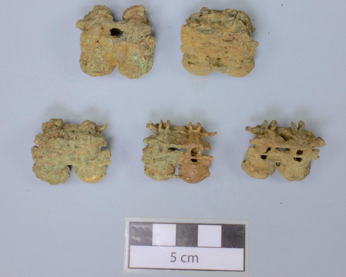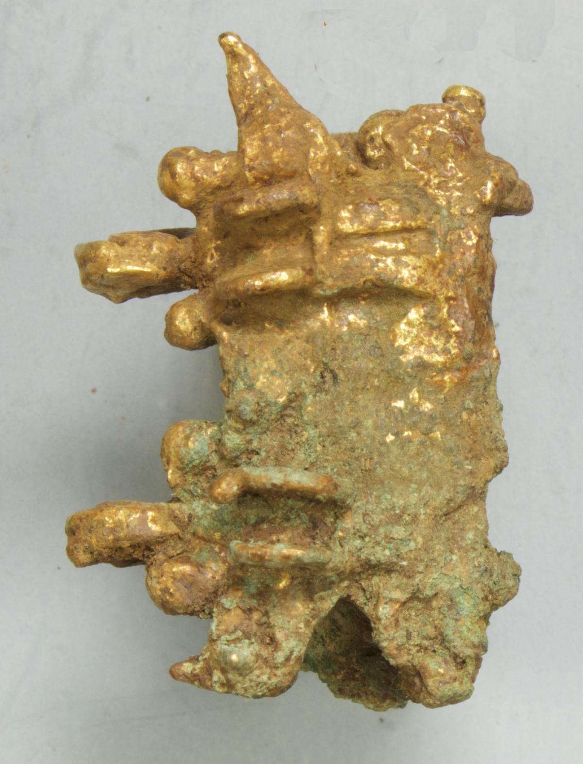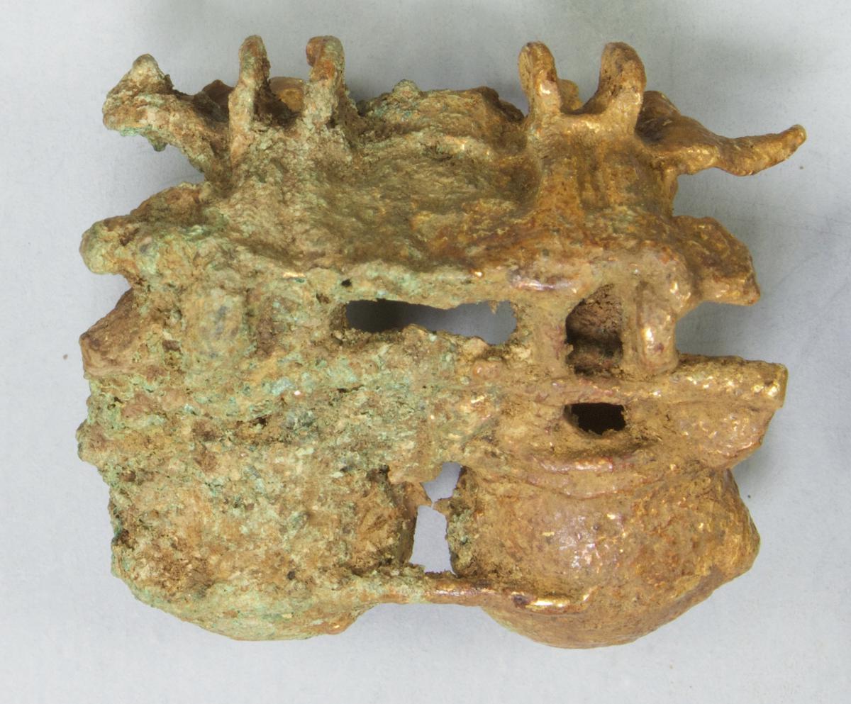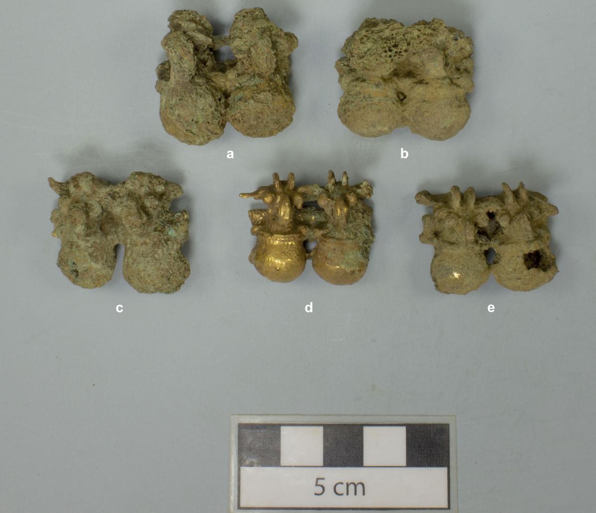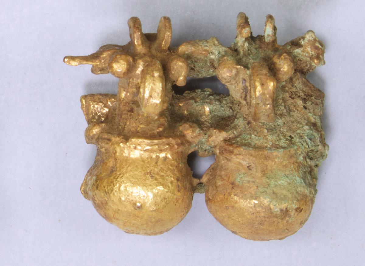 377 - Pendiente figurativo de oro fundido con la representación de un murciélago bicéfalo en vuelo que formaba parte del ajuar del individuo I5 de la tumba T2. EL aro de suspensión se localiza...
