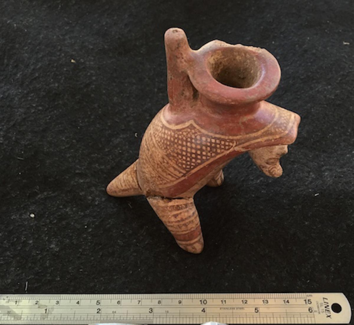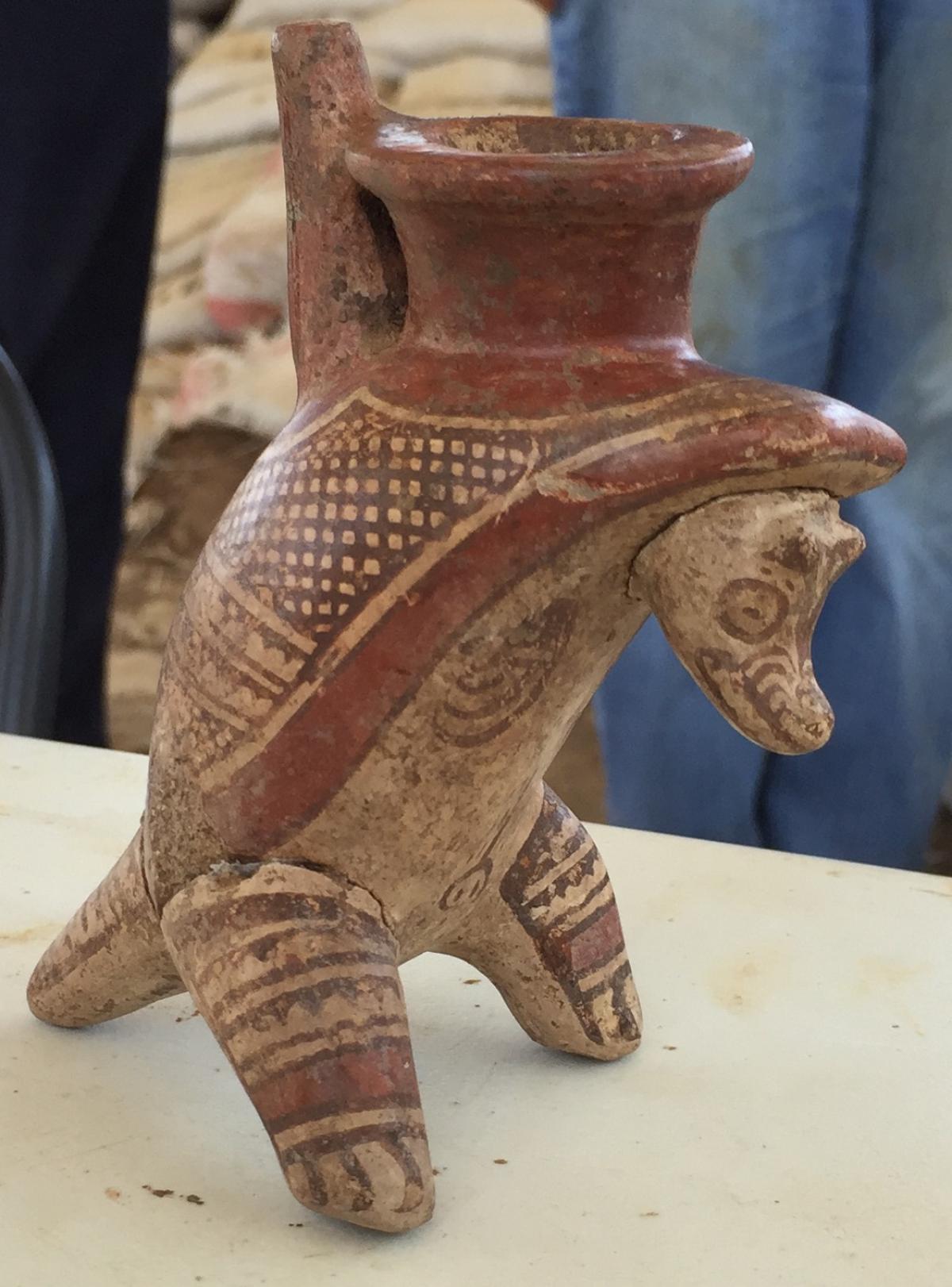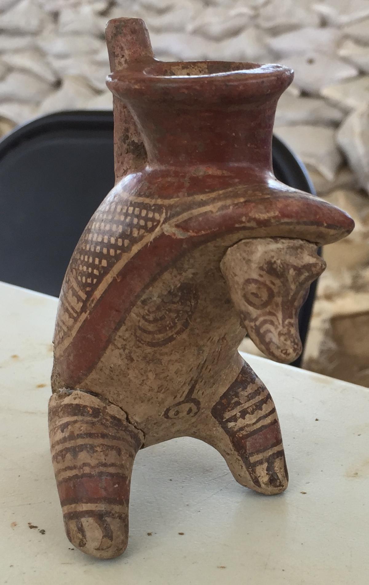 3651 - Jarra zoomorfa. Representa a un venado de cola blanca. Presenta engobe de color blanco en la zona inferior y rojo en la superior.