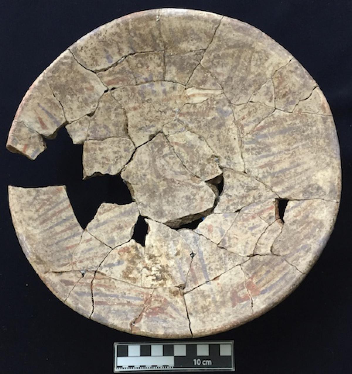 385 - Plato polícromo de borde engrosado exterior. Doble engobe (blanco en el anverso y rojo en el reverso) y decoración en bandas de color alternas zigzagueantes (rojo y morado).