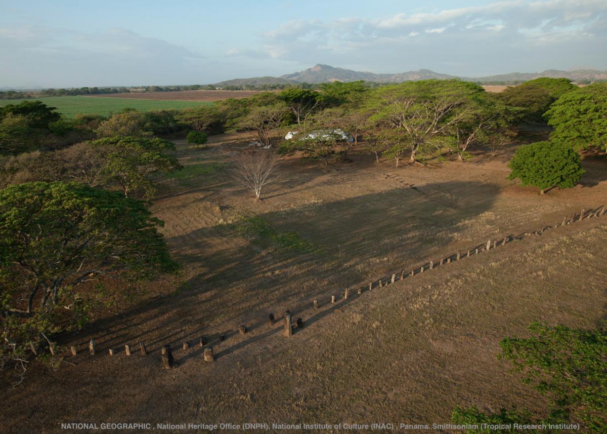 Vista aérea de los alineamientos de monolitos en El Caño, estos podrían delimitar el área ceremonial del Sitio donde se celebrarían este tipo de rituales.
