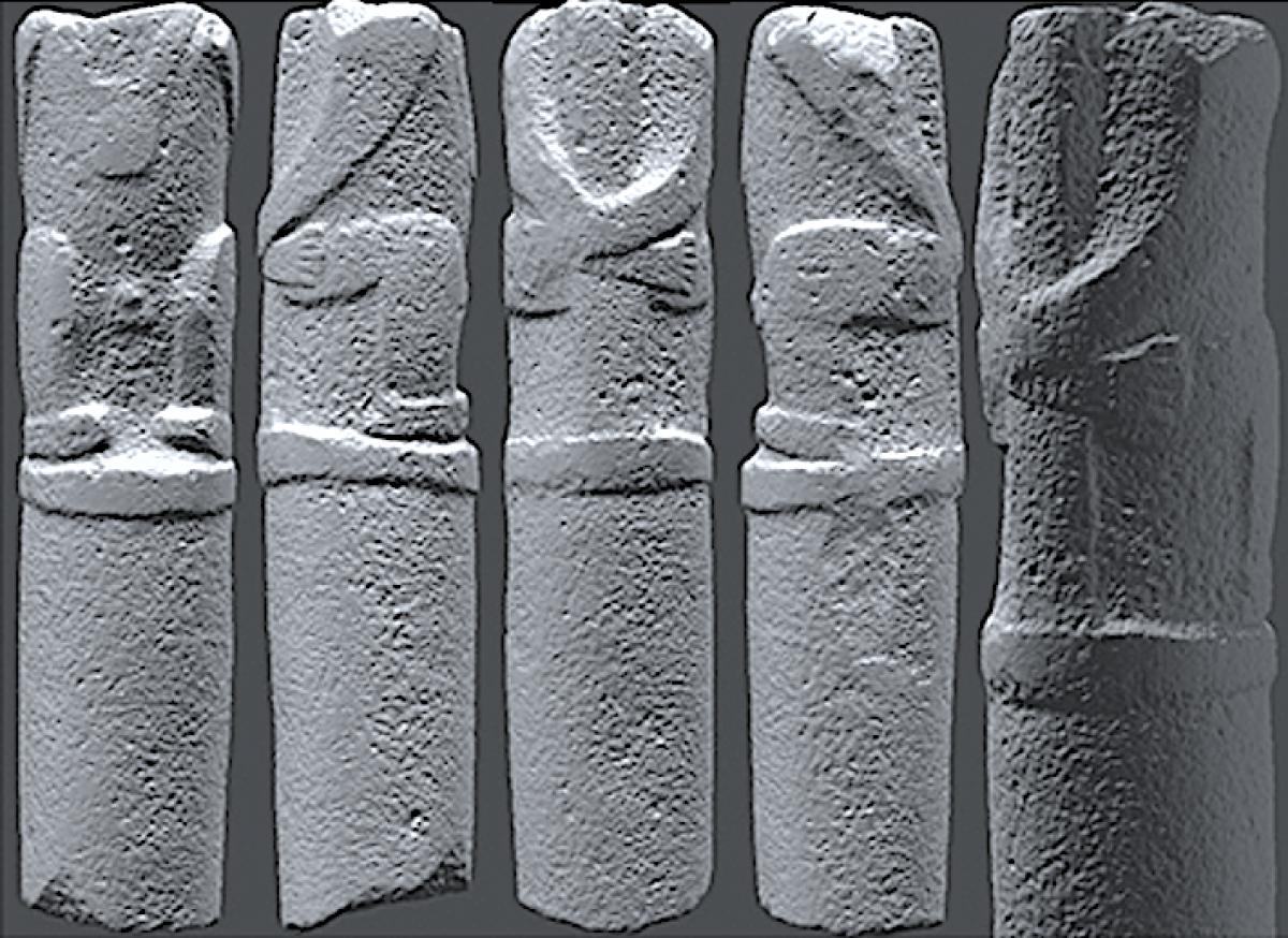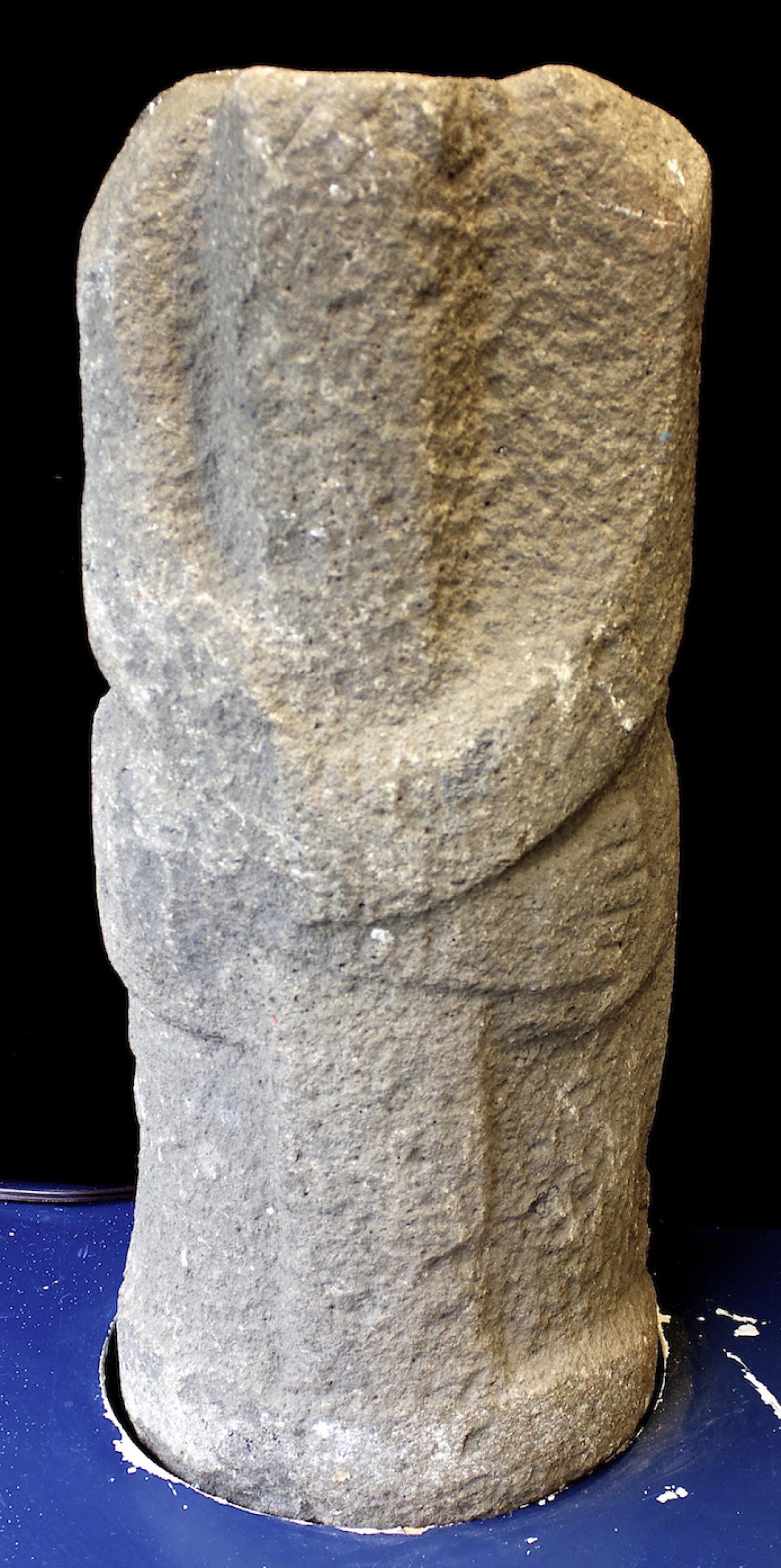 Mono-escena representando a un varón decapitado que lleva un pectoral y está atado a una columna basáltica. Aunque a primera vista pueda parecer que le falta la cabeza, el buen acabado de su parte superior, hace pensar que la pieza representa a un hombre decapitado. El pectoral indicaba que era una persona de alto estatus. Si se relaciona la figura de este varón decapitado con la presencia de cabezas cortadas en las tumbas de los individuos de alto estatus enterrados con acompañantes, se puede inferir que estas esculturas hacen referencia a sacrificios humanos.