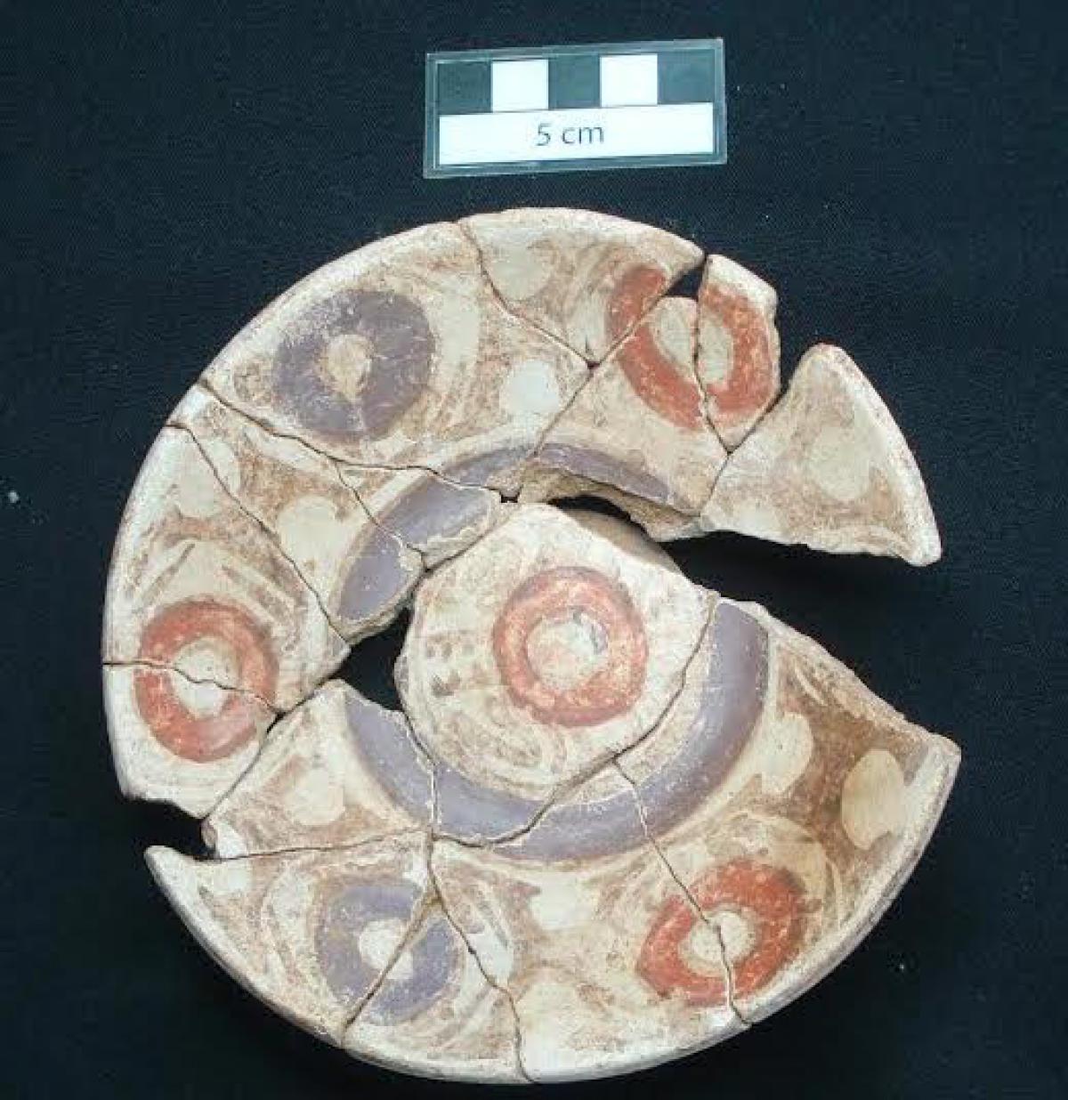385 - Plato polícromo de borde engrosado exterior. Doble engobe (blanco en el anverso y rojo en el reverso) y decoración en bandas de color alternas zigzagueantes (rojo y morado).