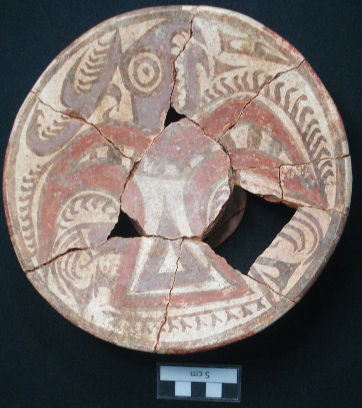 385 - Plato polícromo de borde engrosado exterior. Doble engobe (blanco en el anverso y rojo en el reverso) y decoración en bandas de color alternas zigzagueantes (rojo y morado).