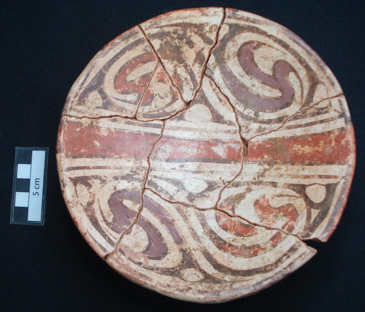 385 - Plato polícromo de borde engrosado exterior. Doble engobe (blanco en el anverso y rojo en el reverso) y decoración en bandas de color alternas zigzagueantes (rojo y morado).