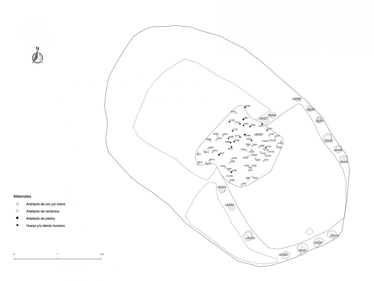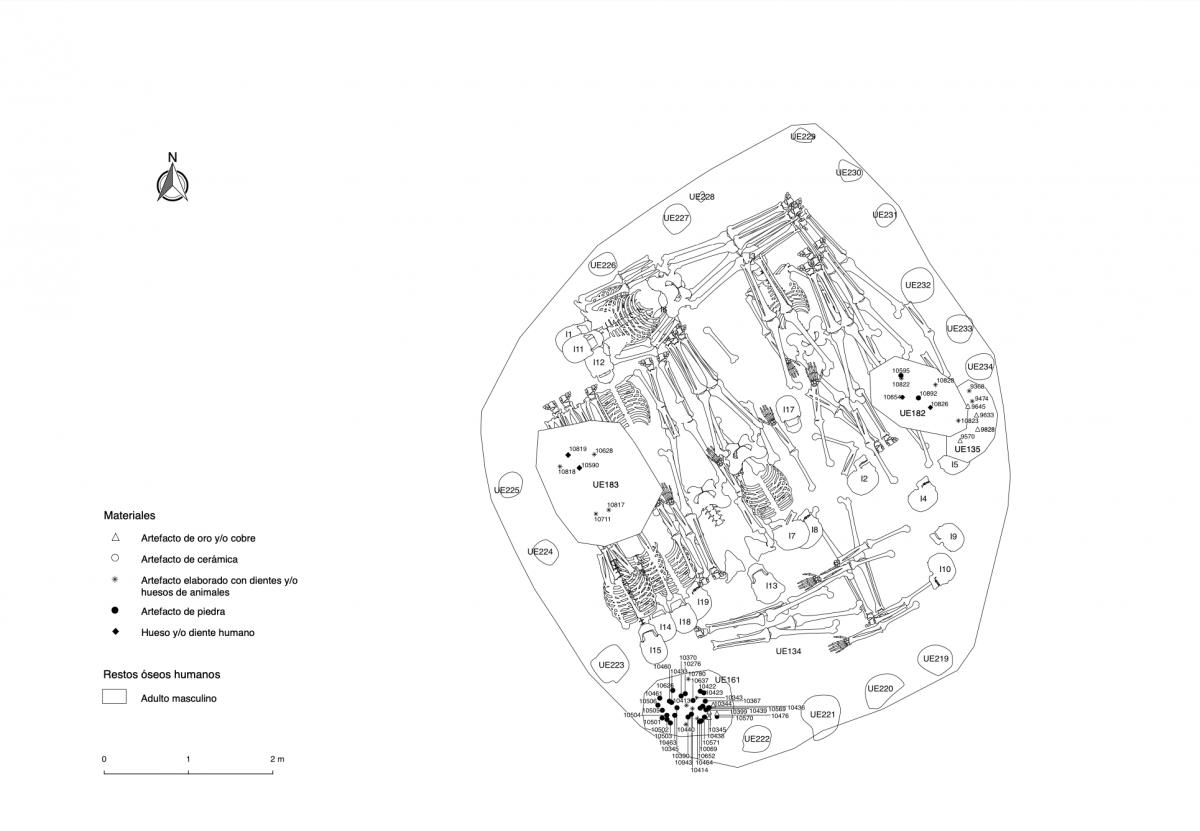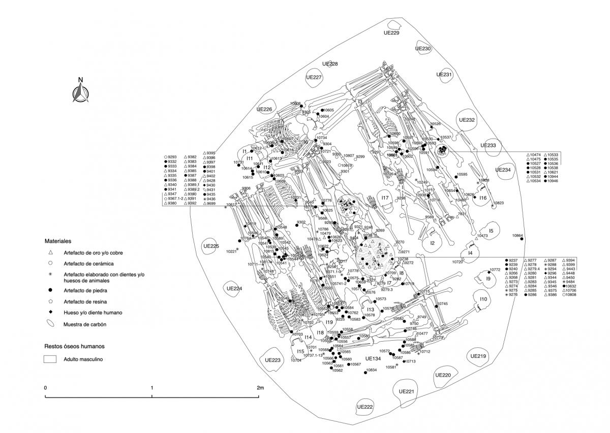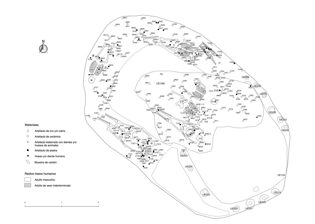 375 - T2-UE088. Depósito de artefactos y osamentas localizado a una profundidad de 2,20 m sobre la Plataforma II (piso más alto) de la tumba T2. Todos los cuerpos fueron colocados en decúbito v...