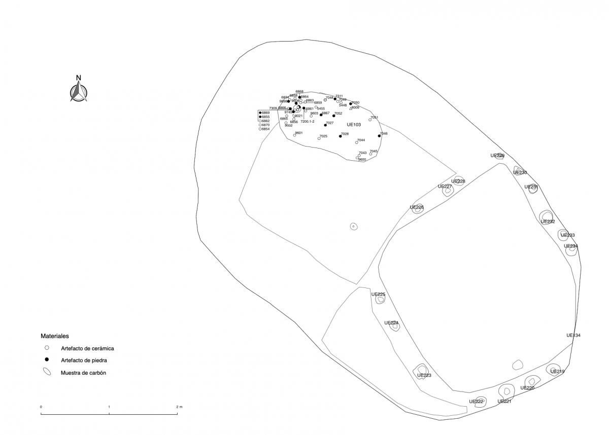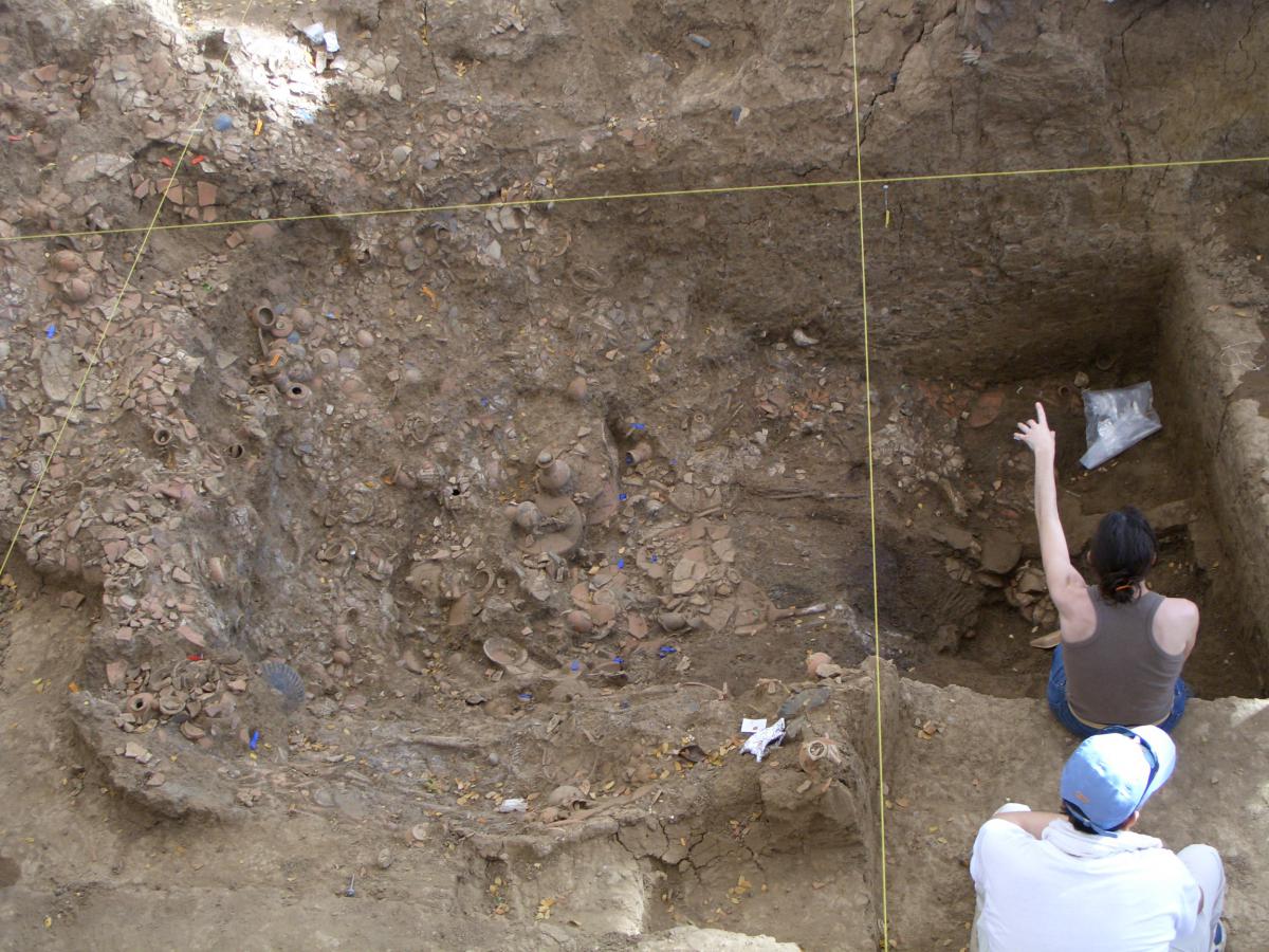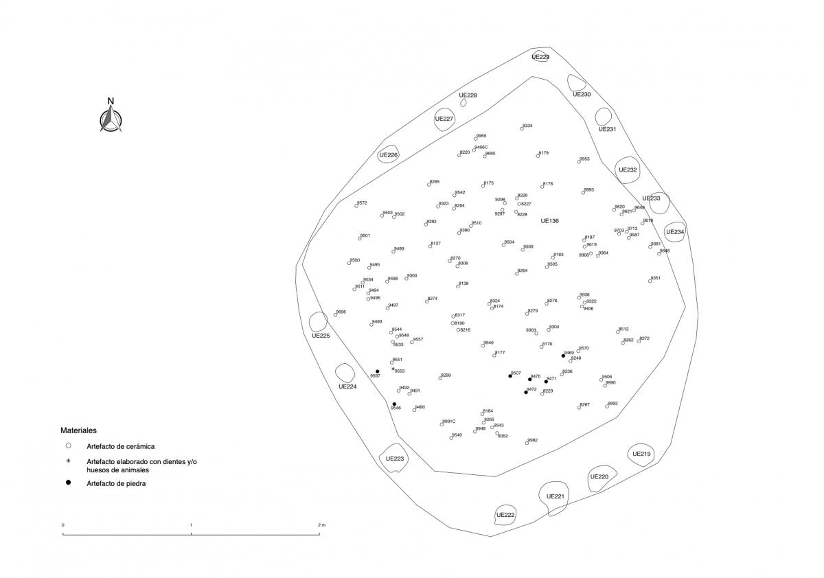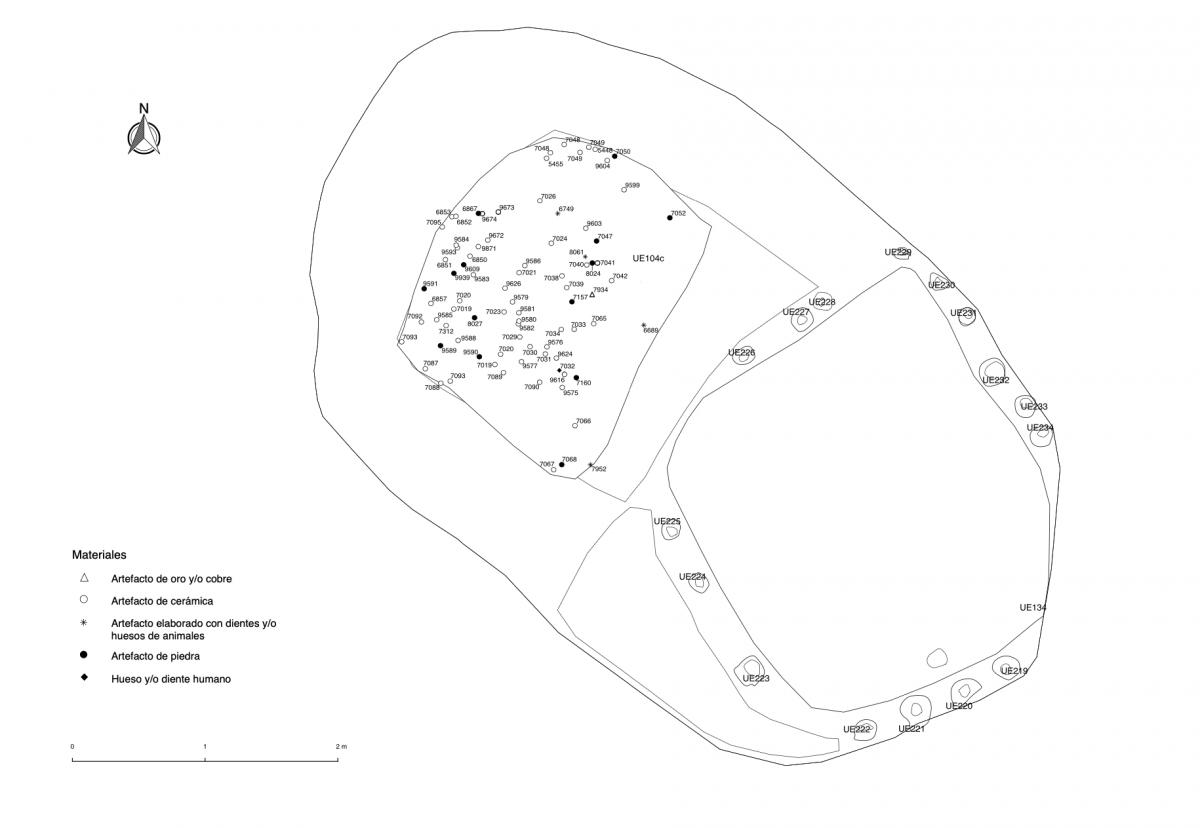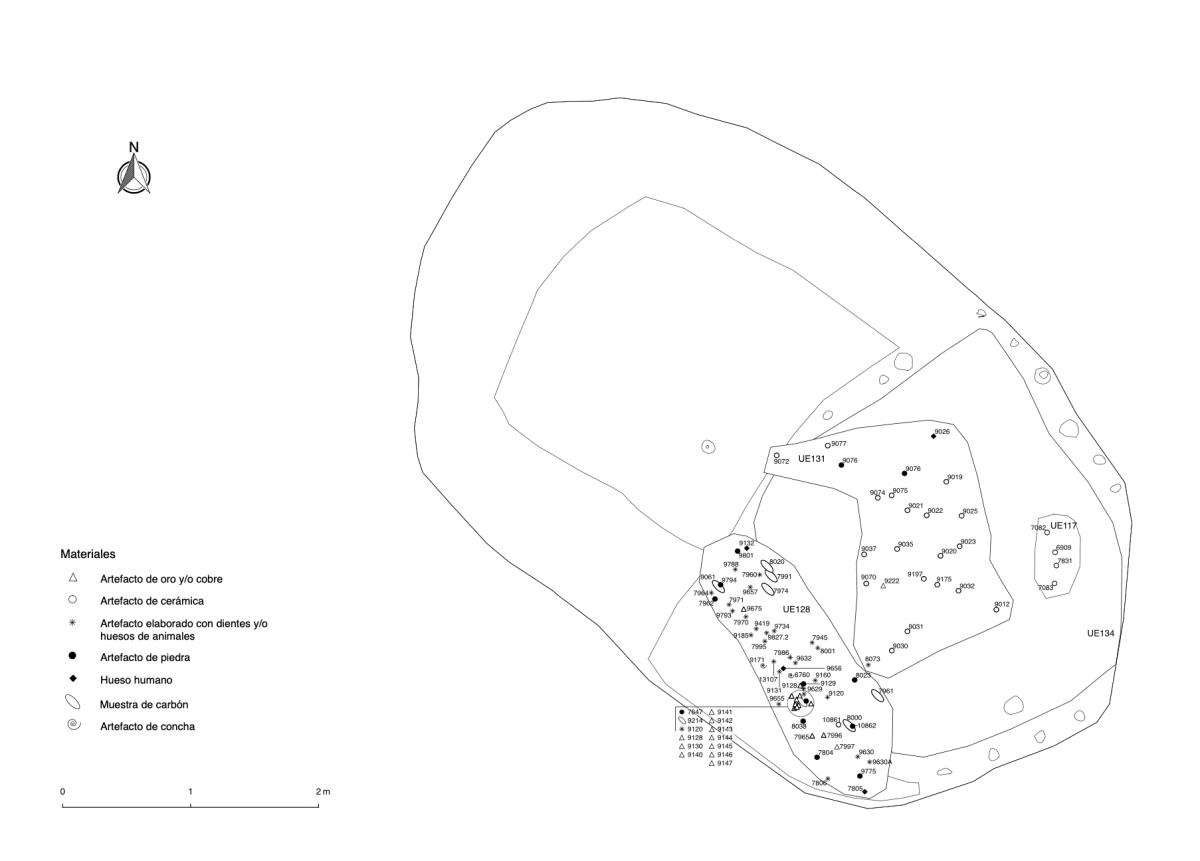 375 - T2-UE088. Depósito de artefactos y osamentas localizado a una profundidad de 2,20 m sobre la Plataforma II (piso más alto) de la tumba T2. Todos los cuerpos fueron colocados en decúbito v...