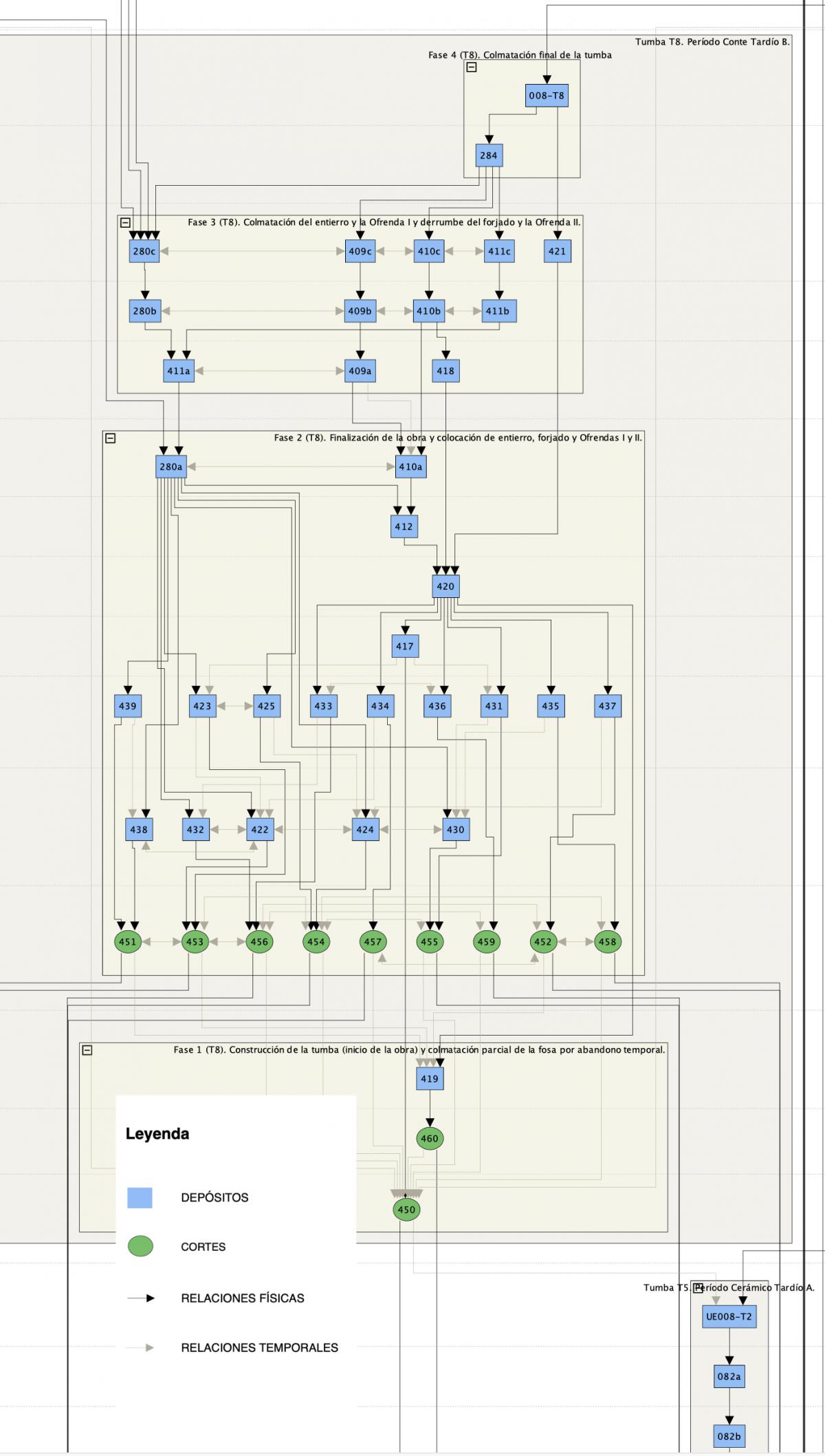 Las flechas de color gris claro y trazado discontinuo representan las relaciones cronológicas, - la sincronía se expresa con flechas de trazado horizontal, mientras que la relación entre unidades no contemporáneas se expresa con flechas de trazo vertical.