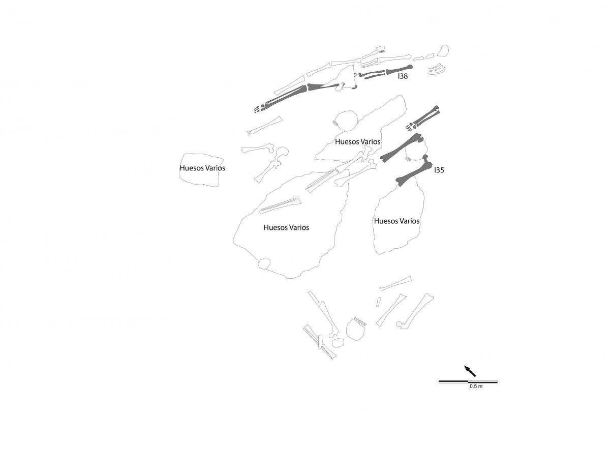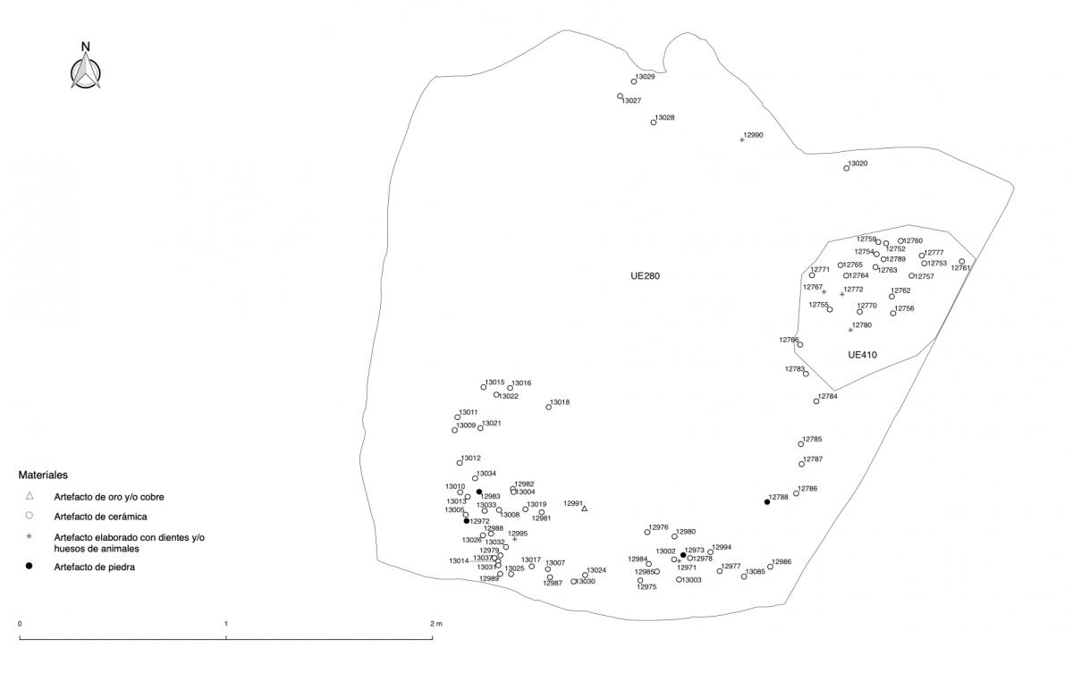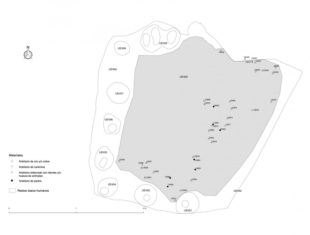 375 - T2-UE088. Depósito de artefactos y osamentas localizado a una profundidad de 2,20 m sobre la Plataforma II (piso más alto) de la tumba T2. Todos los cuerpos fueron colocados en decúbito v...